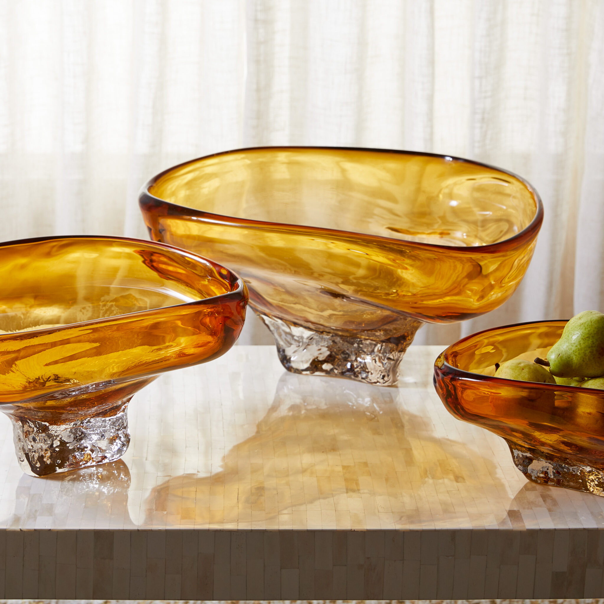 The Alistair Bowl, handblown in warm amber molten glass brings artisanal elegance to any space. Available in three sizes, it can be paired together for a layered look or displayed separately as a striking decorative piece.