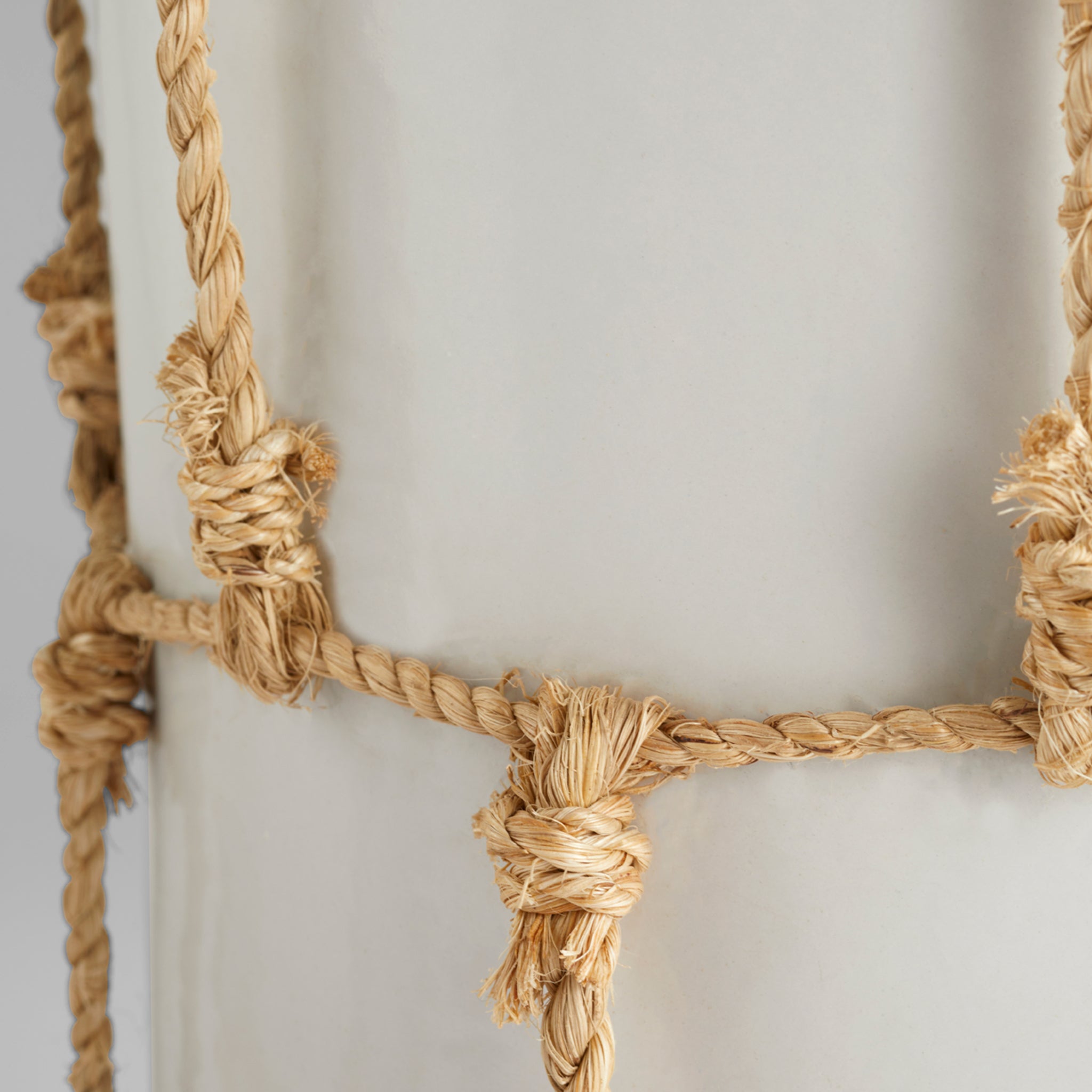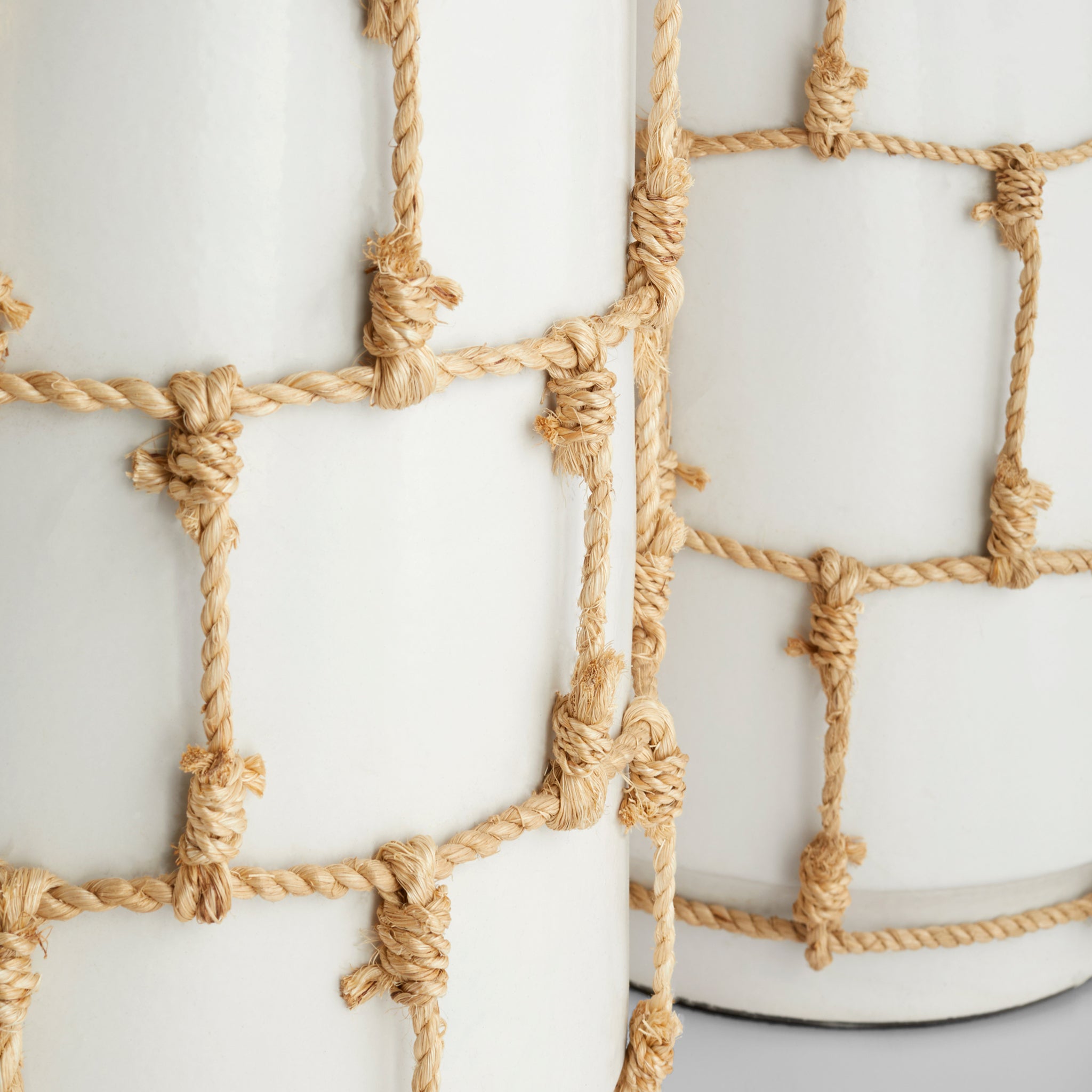 With the spirit of the oldest known fishing net in the world, the Antrea collection features hand-knotted jute rope cinched around a cylindrical earthenware contour with a tapered base and rim. Satin white finishes contrast the natural fibers of the detailing. Create a centerpiece on a kitchen island, group together on a living room console table or use to store fruits on a breakfast dining table. Available in three options. Not water-tight.