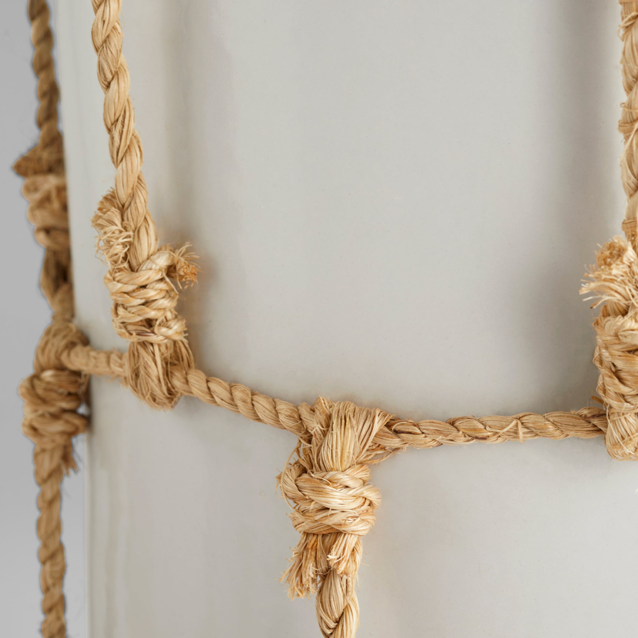 With the spirit of the oldest known fishing net in the world, the Antrea collection features hand-knotted jute rope cinched around a cylindrical earthenware contour with a tapered base and rim. Satin white finishes contrast the natural fibers of the detailing. Create a centerpiece on a kitchen island, group together on a living room console table or use to store fruits on a breakfast dining table. Available in three options. Not water-tight.