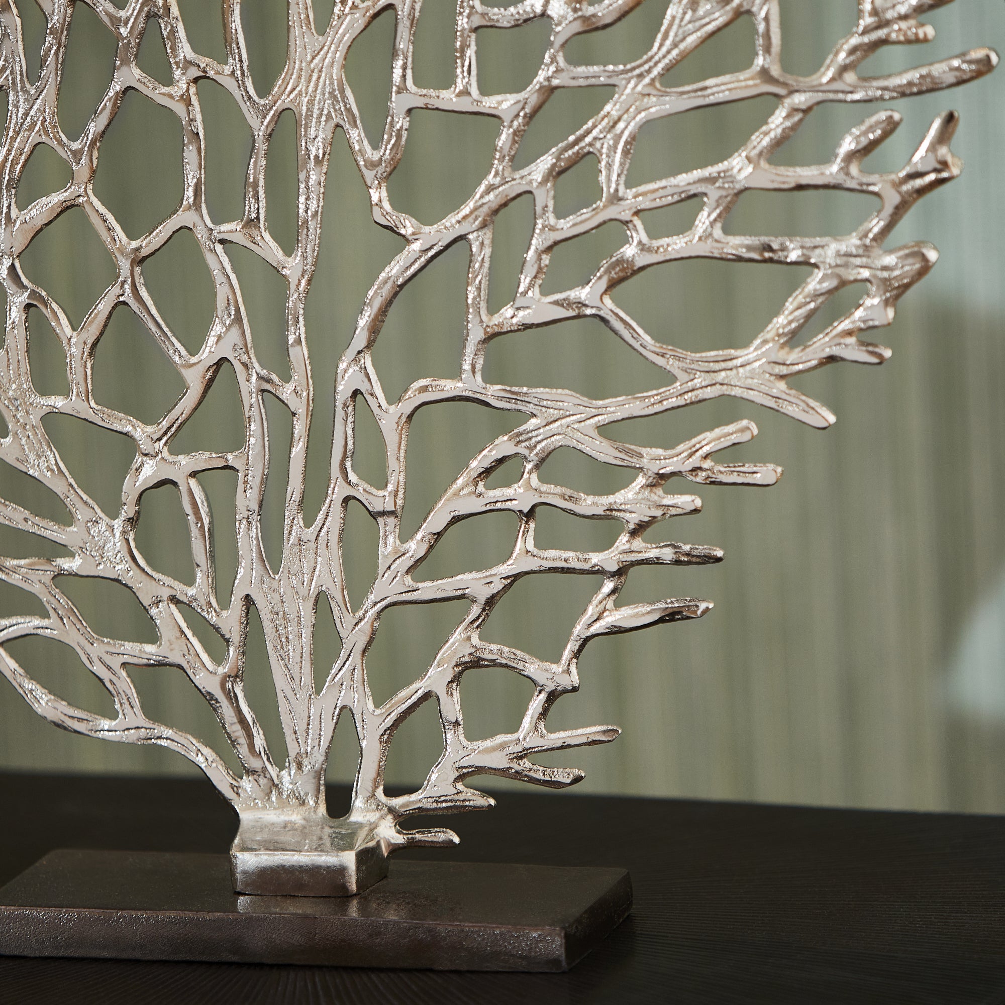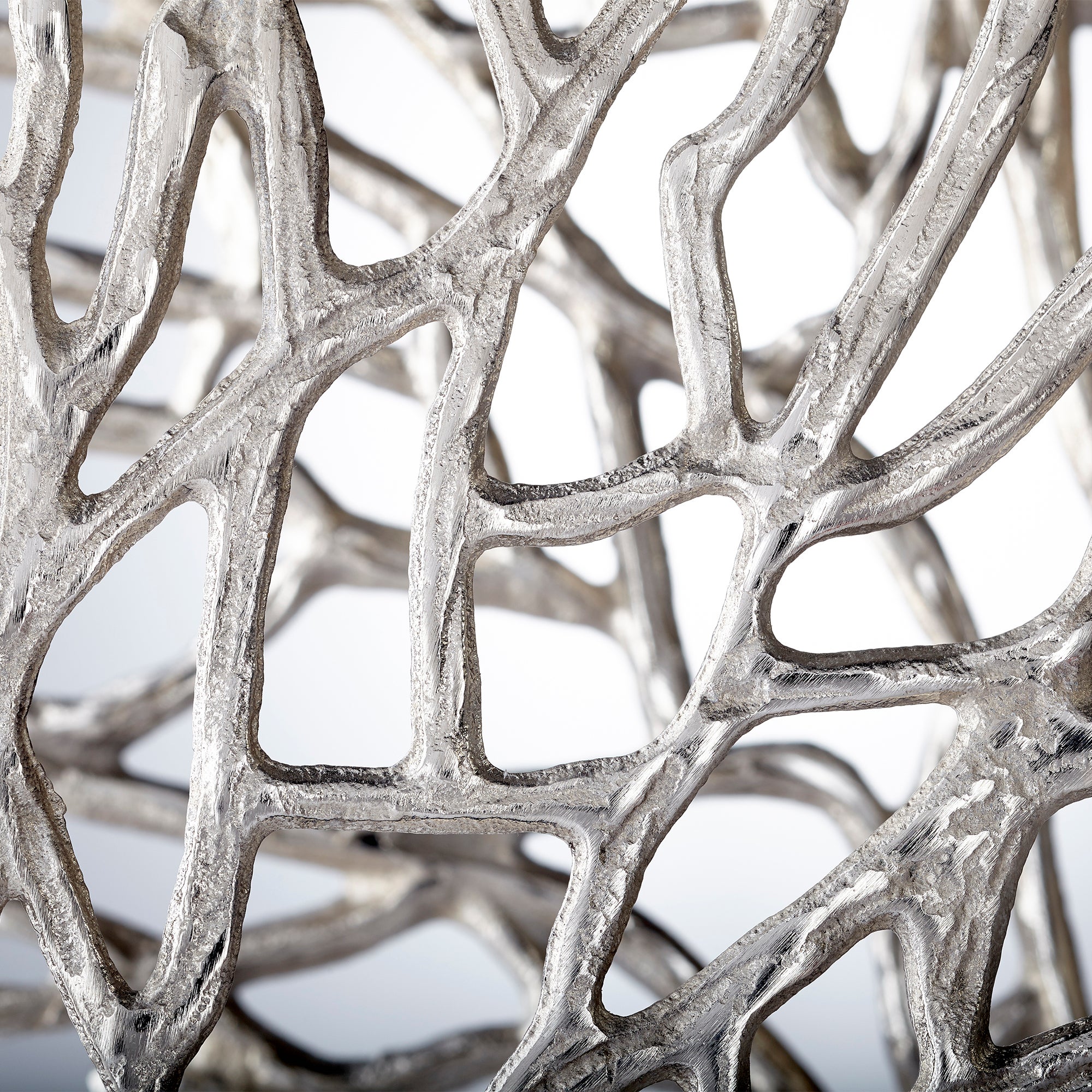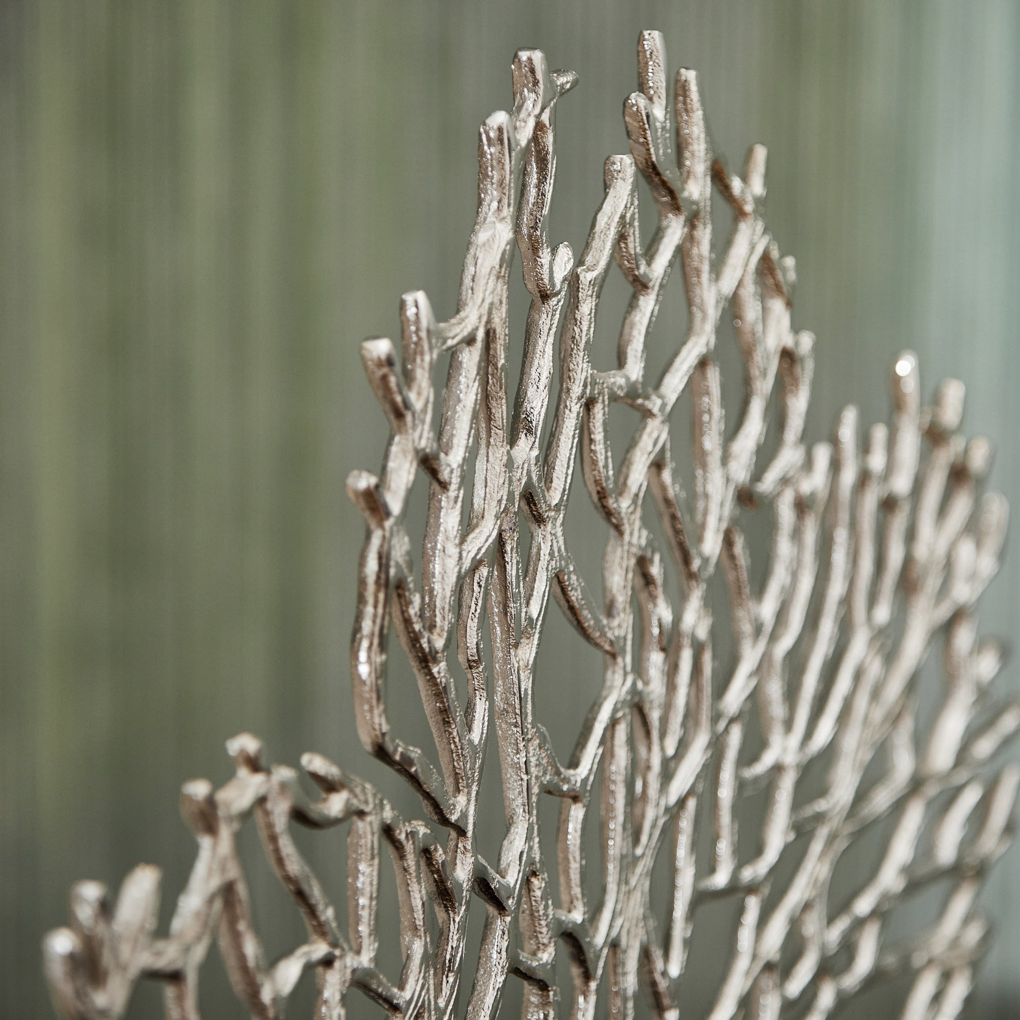 Evoking the most delicate of fan coral, this large sculpture is a dynamic addition to contemporary coastal decor. Featuring a bronze base, the coral piece features a gleaming nickel finish that stands out in any selected spot on a shelf or tabletop.