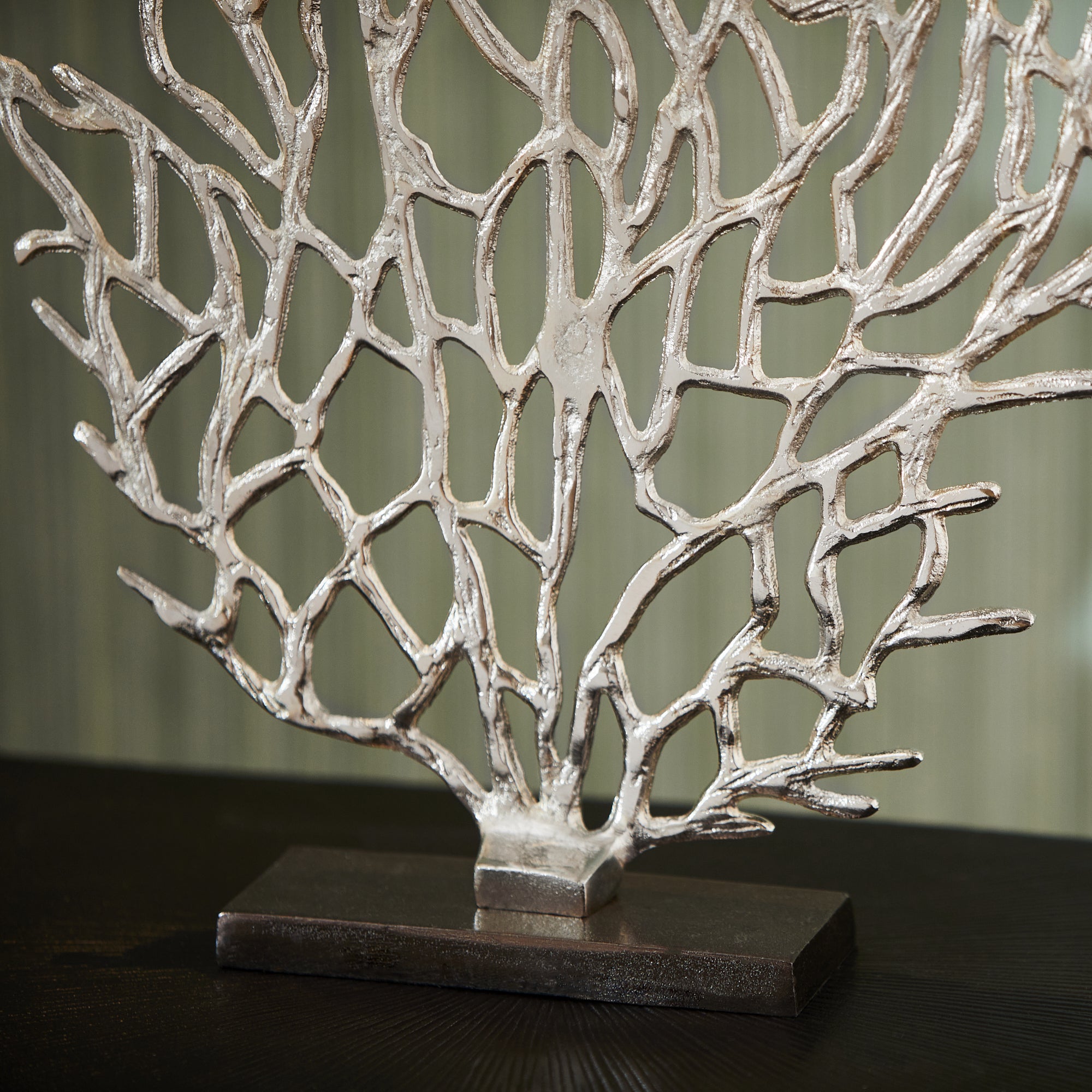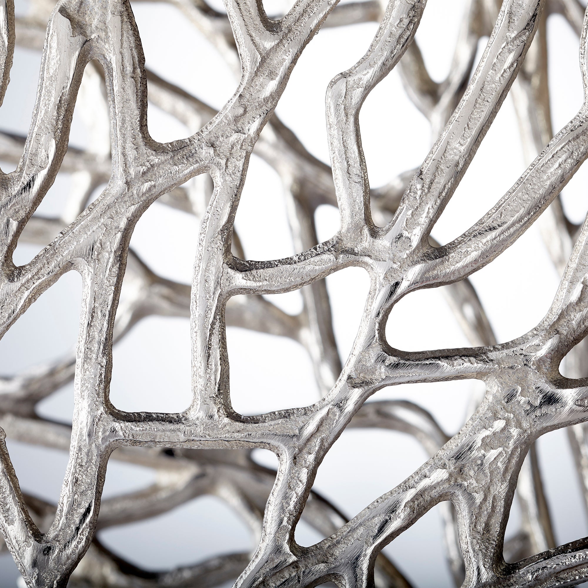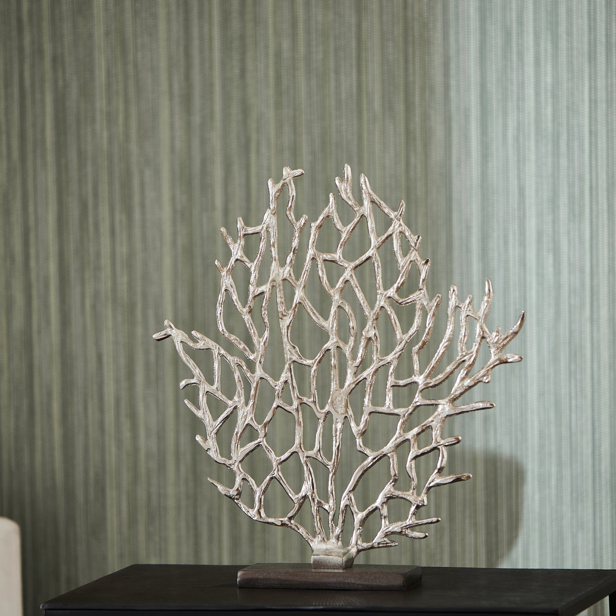 Evoking the most delicate of fan coral, this small sculpture is a dynamic addition to contemporary coastal decor. Featuring a bronze base, the coral piece features a gleaming nickel finish that stands out in any selected spot on a shelf or tabletop.