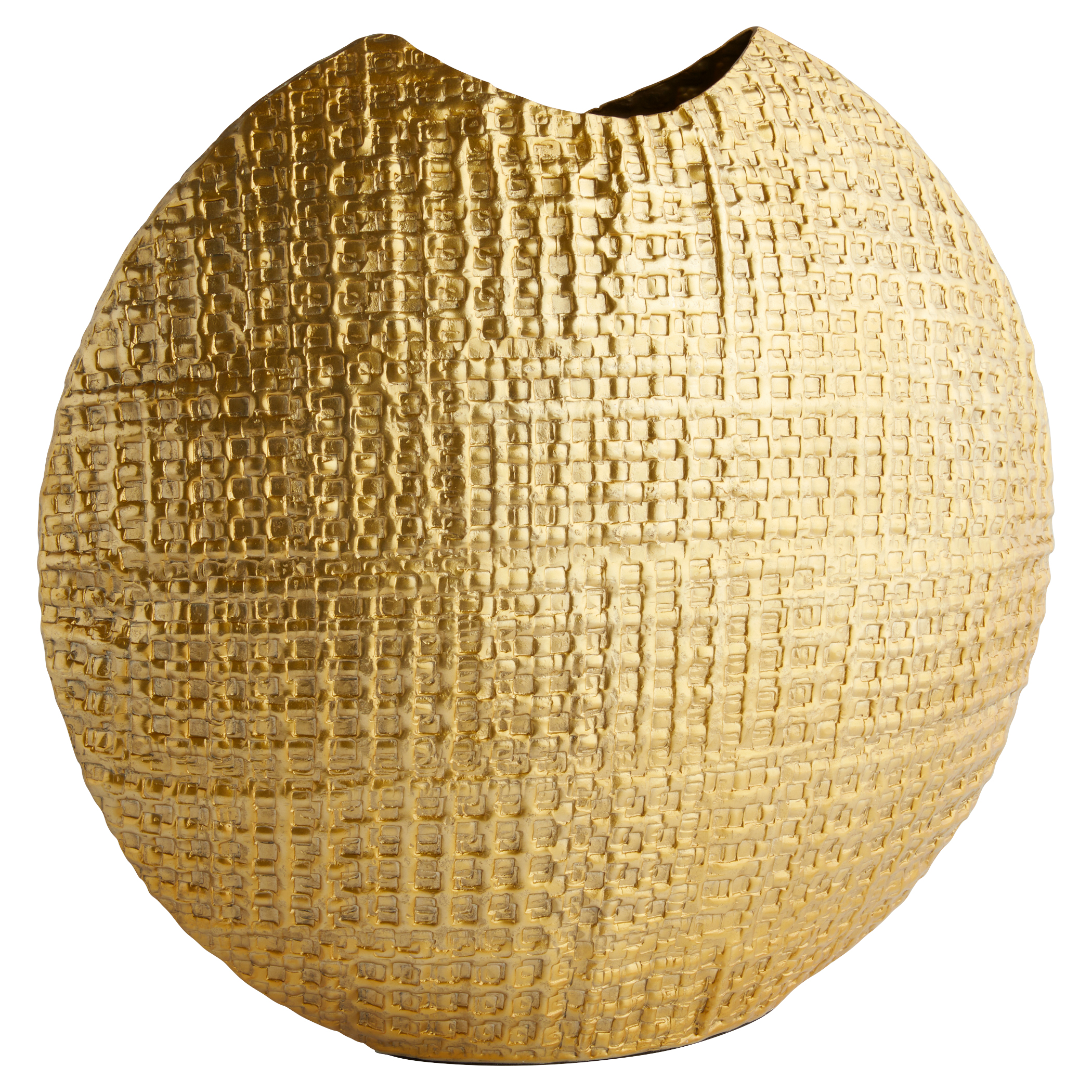 The Artemios Collection features a bold embossed geometric pattern that catches the light, enhanced by a satin gold finish. Crafted from cast aluminum, its textured surface adds depth and dimension. Available in various shapes and styles, it offers versatile options for styling any space.