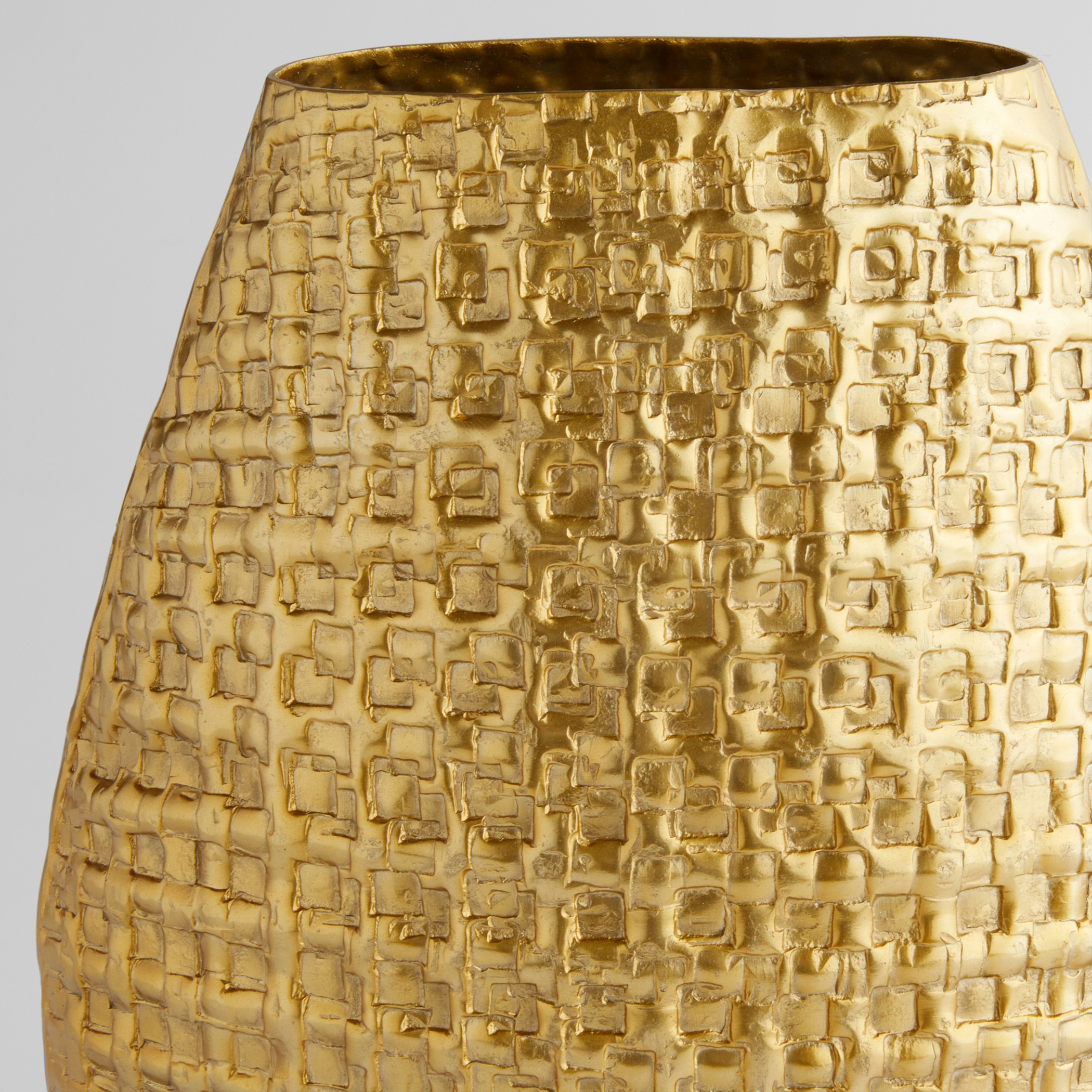 The Artemios Collection features a bold embossed geometric pattern that catches the light, enhanced by a satin gold finish. Crafted from cast aluminum, its textured surface adds depth and dimension. Available in various shapes and styles, it offers versatile options for styling any space.