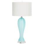 Delightful floral accents tell the tale of a romantic ambiance. This glass table lamp celebrates a lovely blue glass body with elegant curves, while a white cotton shade features a surprising floral lining that delivers a lovely garden effect.