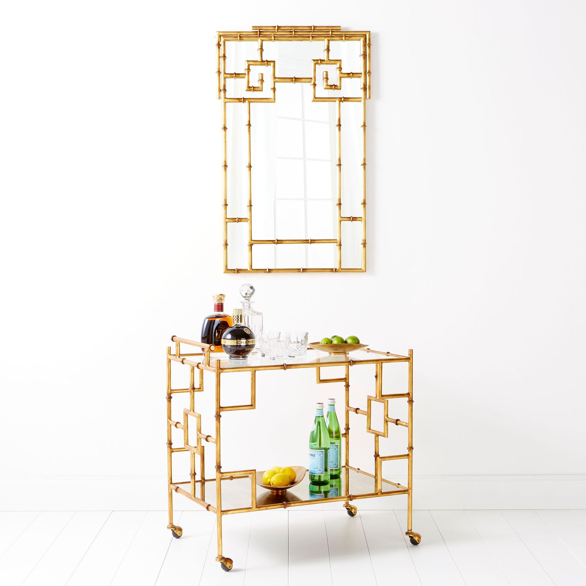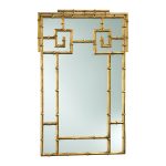 A twist on Egyptian-inspired decor, this gold mirror looks great in any hallway. Bamboo formed by iron shapes the interesting frame, while the large mirrored glass backdrop draws in the eye.
