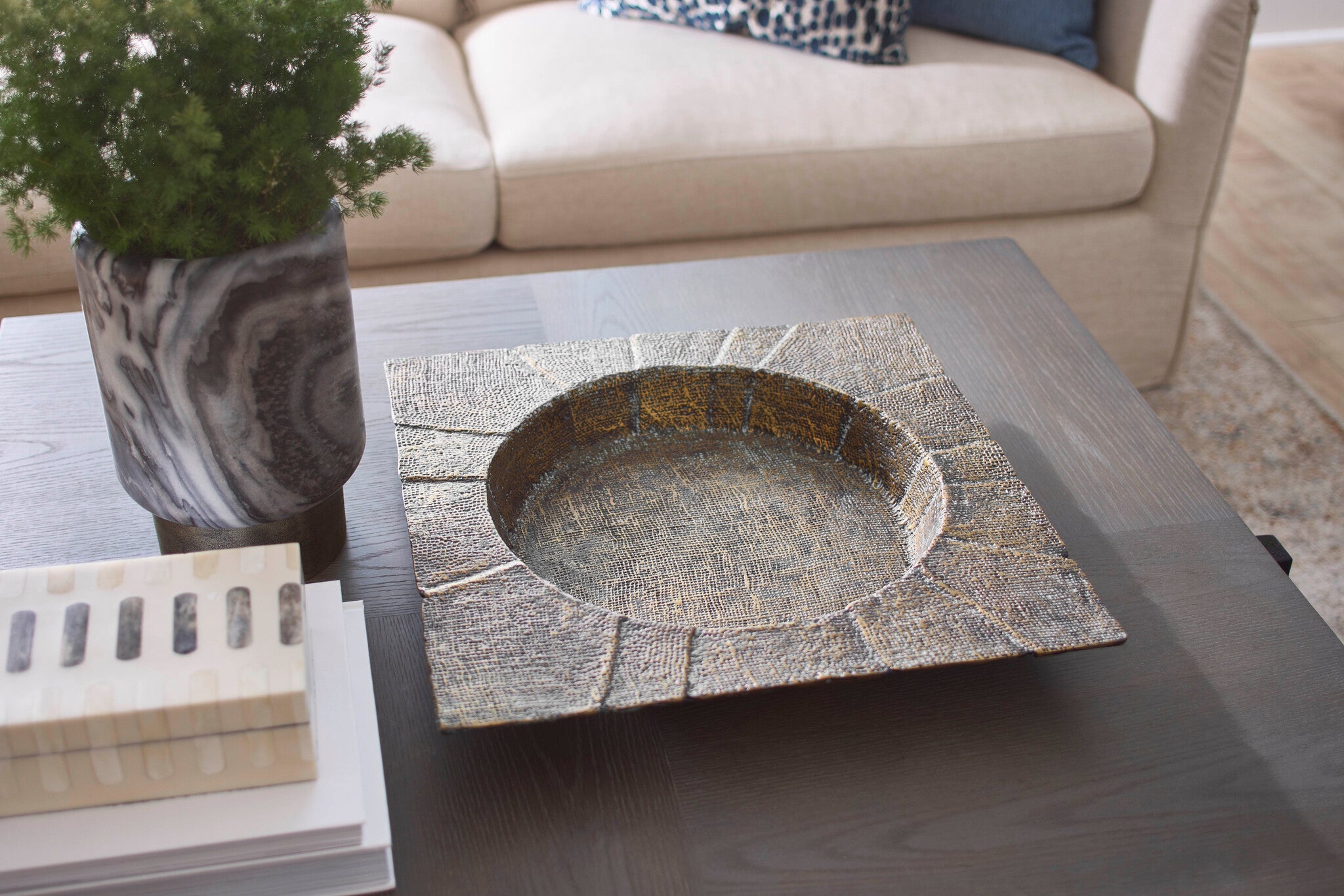 The Baxter Trays are made from highly textured cast aluminum, evoking the tactile quality of heavy burlap. The texture not only adds character but also infuses a sense of depth and intrigue, inviting you to explore their surfaces. The outer edges of the Baxter Trays resemble flowing folds of fabric, which add a soft and organic touch to the overall design. These trays can be used in a multitude of ways, serving as a stunning table tray or easily hung on the wall with factory-mounted keyholes, allowing for a striking wall display. Finished in an Antique Pewter finish, the Baxter trays exude a timeless and regal charm.