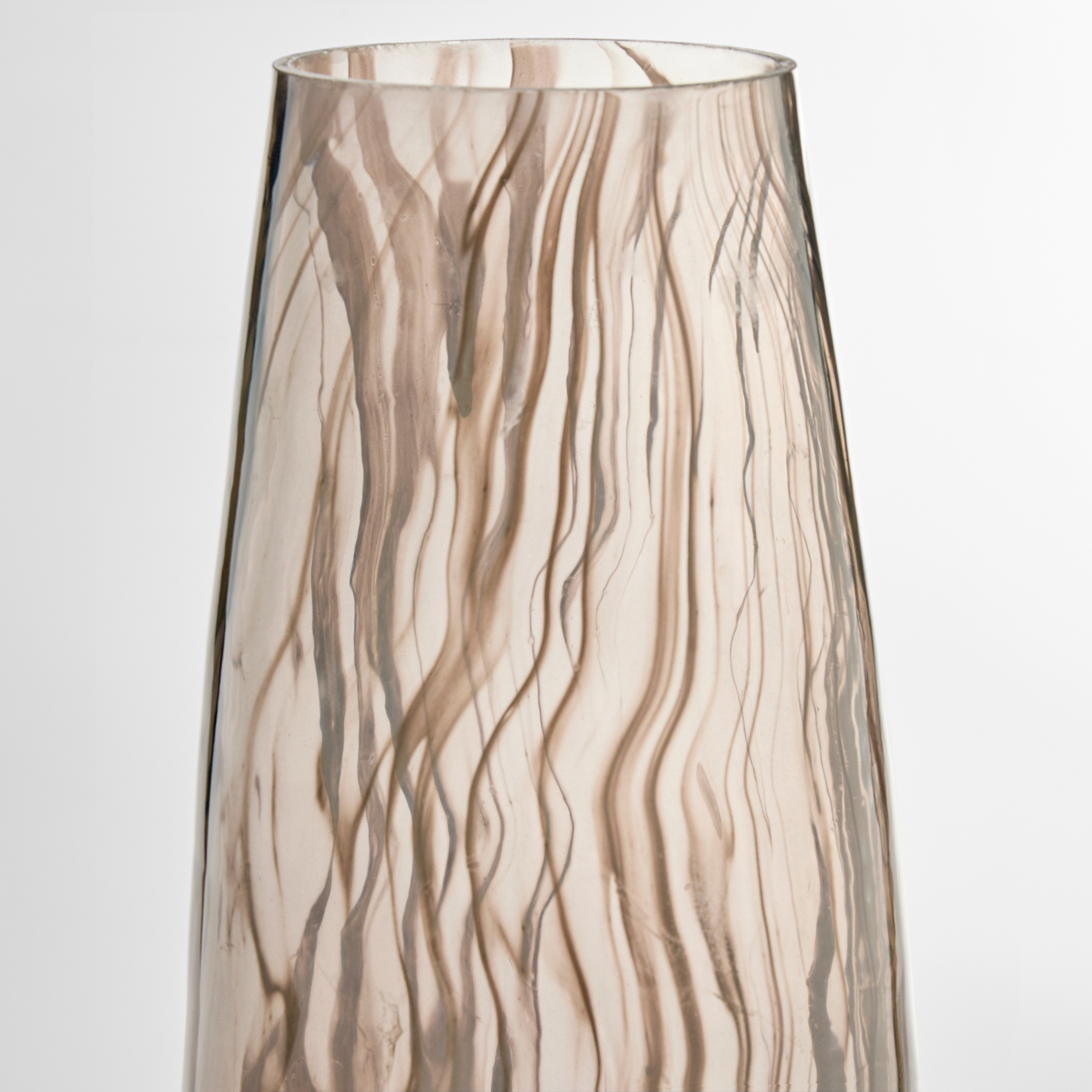 With its large-scale and bottom-tapered shape, the Billow vase, cast from transparent grey glass, serve as a canvas for the swirling white wisps that dance through the vase. Each vase is one of a kind, with its own unique pattern formed by the flowing molten glass.