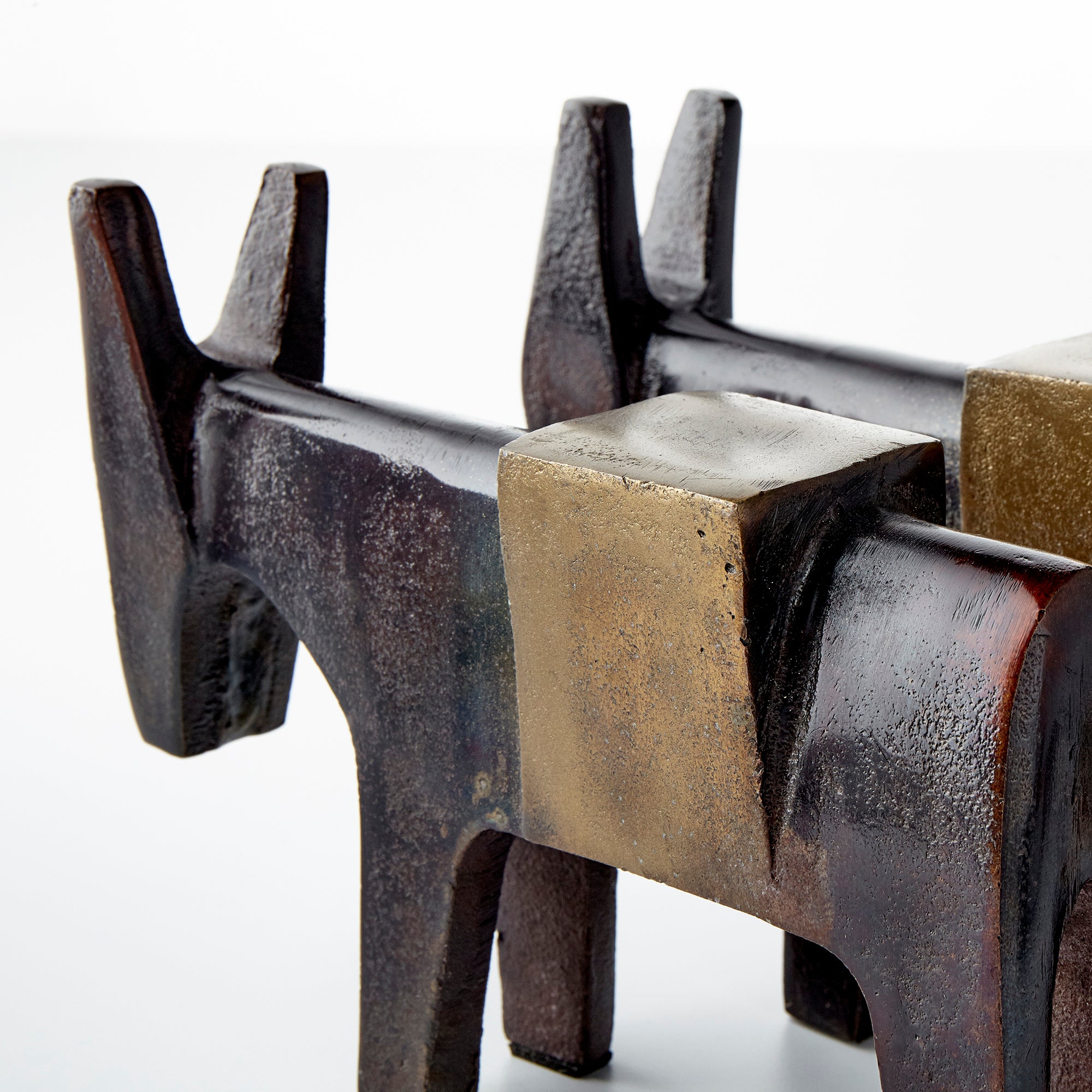 Traditional African-inspired decor gets a modern, rustic upgrade with this bronze bongo sculpture. The minimalist, angular silhouette and complementary metallic details refine the metal figurine. Dress up any mantel or living room side table.