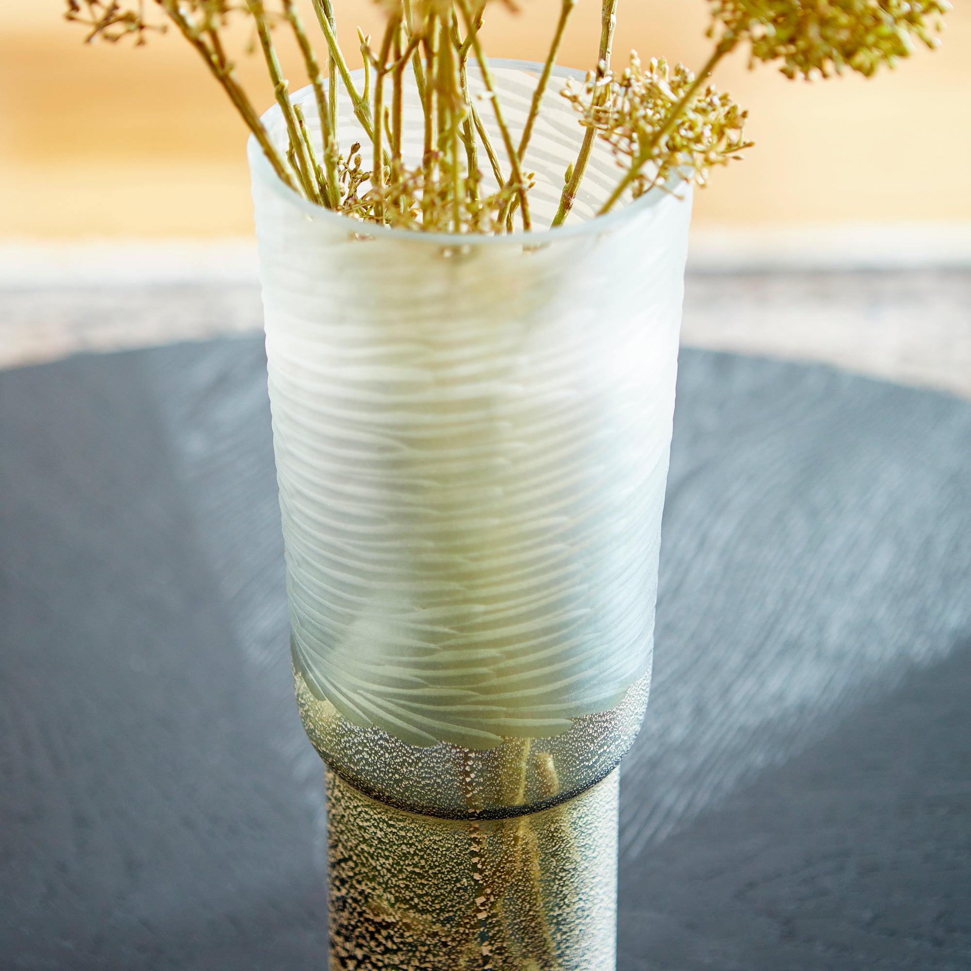 Variance in texture, tone, and size are what make the Canyonland vase standout from the rest. This reverse tulip-silhouette sports a gradient clear to gilded silver surface finish. Transitional versatility offers this vessel a place in any contemporary setting. Adorn your living room, entryway, or commercial lobby display with multiple Canyonland vases (available in three sizes) and top with a floral bouquet for an added natural touch.