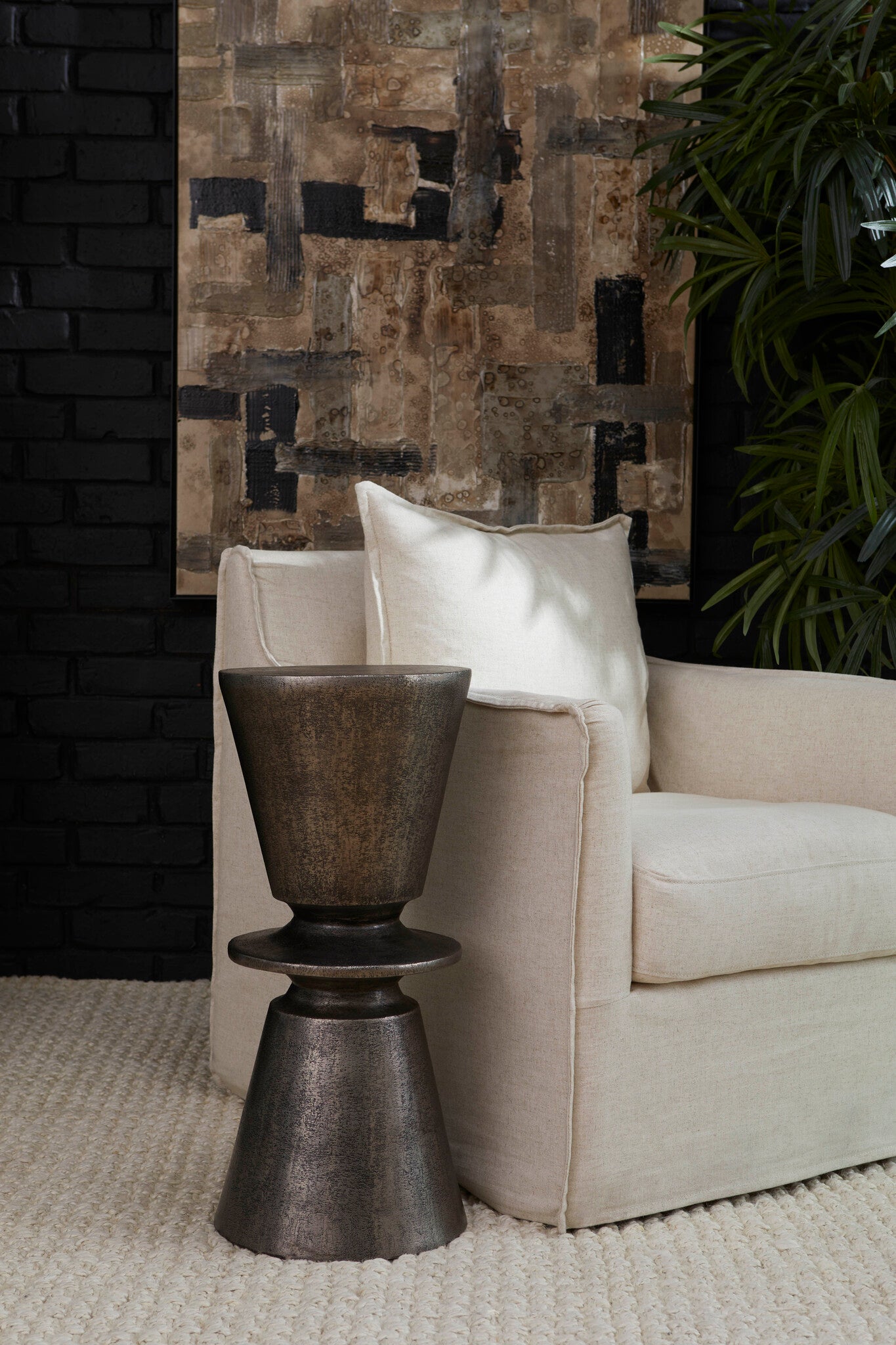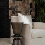 The Clepsydra accent tables are a perfect embodiment of elegance in a compact form. Antique brass or antique nickel finishes complement a highly-textured surface akin to coarse burlap, infusing the design with a commanding charm. Its ideal size makes it a versatile choice for an accent table.