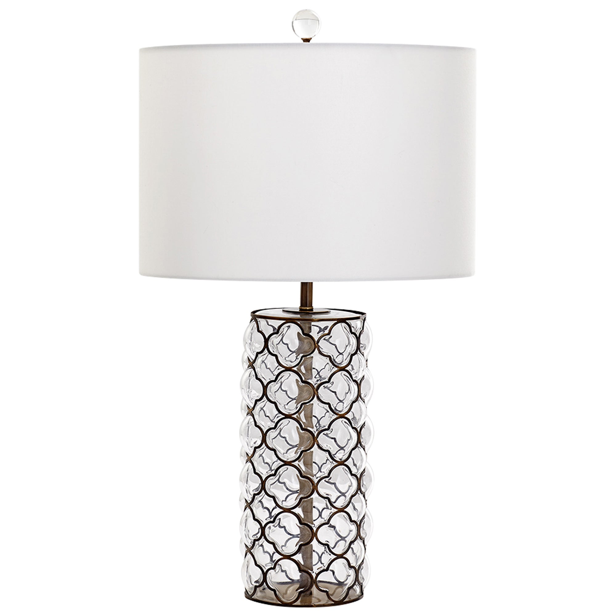 Clear glass bubbles up through the center of iron quatrefoil openwork to create a stunning look for this transitional glass table lamp. In a satin brass finish that delivers classic elegance, this lamp is topped with a white fabric drum shade and a crystal finial to match its round crystal foot. Elegant in any room, this table lamp is a striking way to add texture and depth.