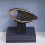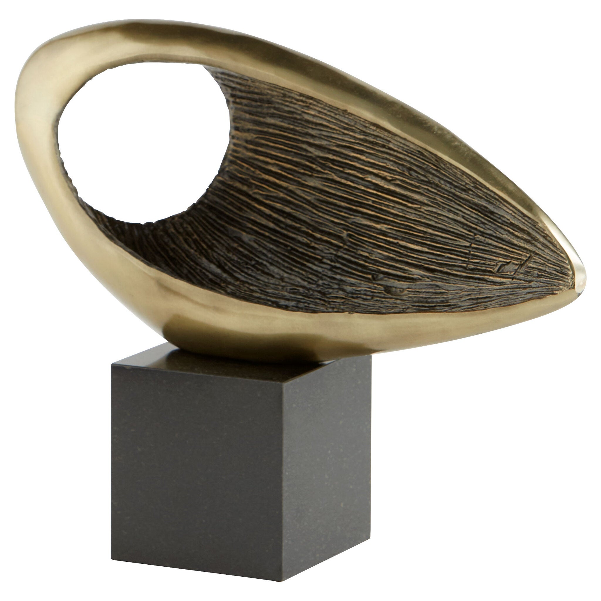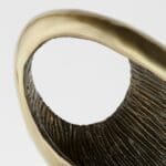 The Delphina sculpture is a smooth abstract adaptation of a tidal wave crashing in on itself. The smooth, calm exterior is contrasted by a raked texture interior. A bronze finish is applied to sand cast iron atop a granite base, keeping the sculpture rooted in elegance with an artistic flair. Place on a bookshelf, side table or console table to inspire meaningful conversation.