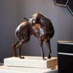 Delightfully charming and capricious, this dog and butterfly sculpture will bring a sense of joy to a formal living room. A rubbed red finish brings a colorful element to a modern or cottage style.