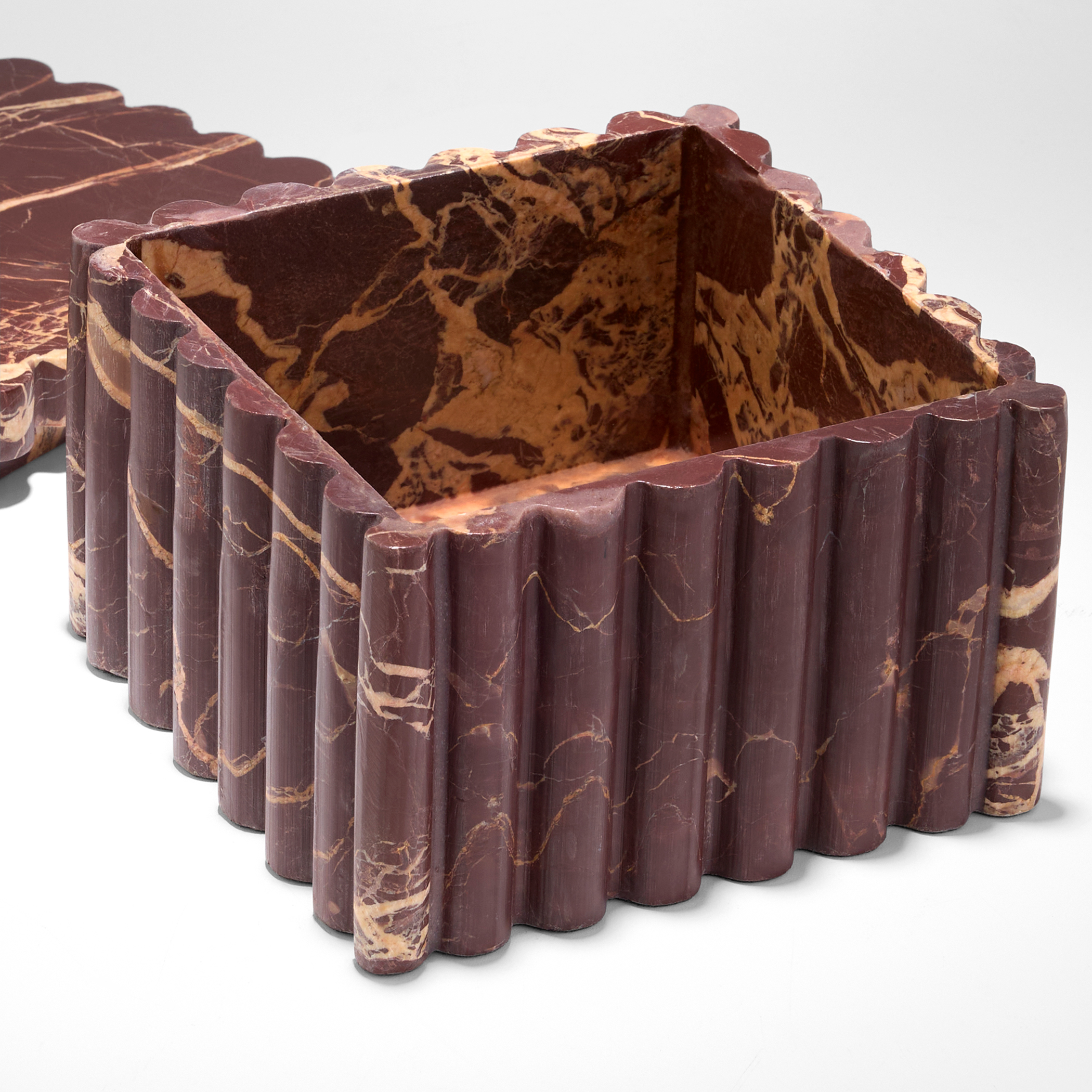The Dorian Boxes draw inspiration from the timeless elegance of ancient Greek Doric columns, showcasing architectural simplicity in a refined form. Crafted from fluted burgundy marble, each box highlights the rich contrast between intricate texture and clean lines. Available in multiple sizes, they are perfect for creating a striking stacked display.