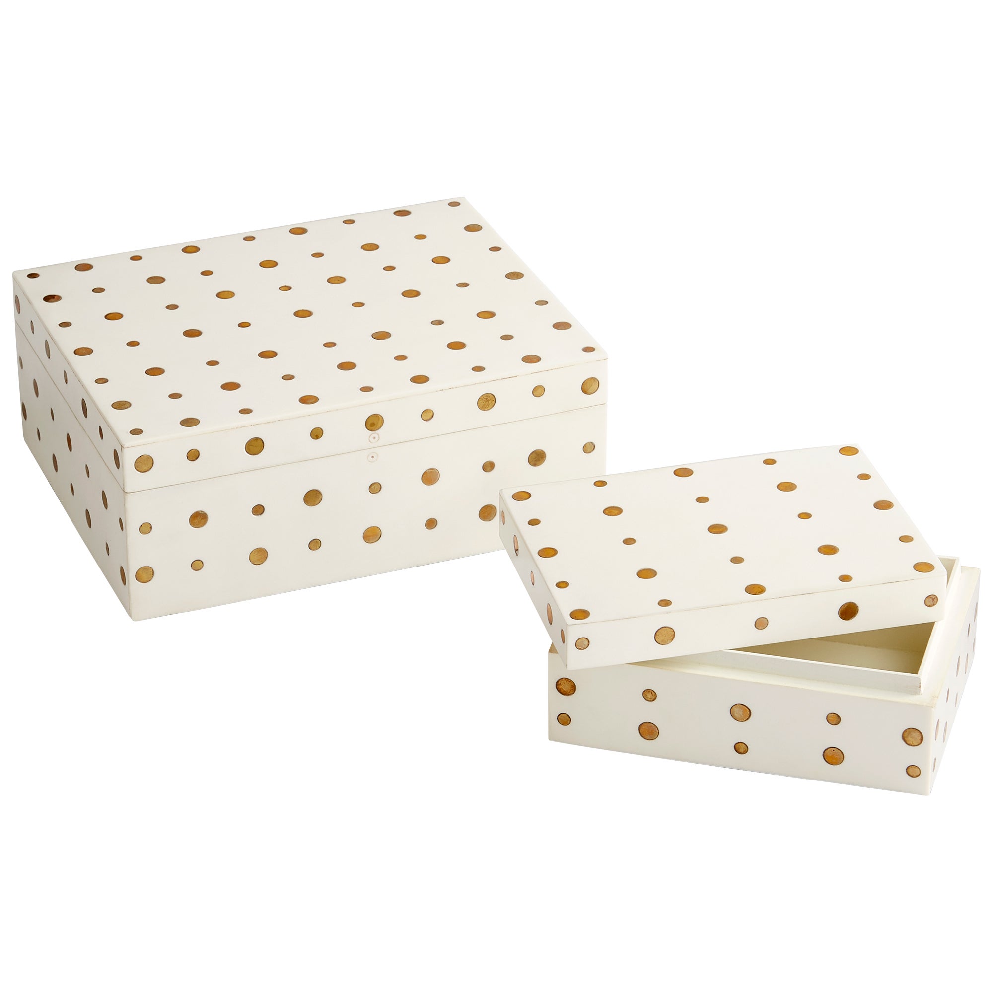 This Dot Crown Decorative Box will be the ideal location to store all your small prized possessions. The classic design will also be a great accessory for any bedroom or bathroom. The brass accents dots and complementary cream colored resin give the eye-catching container unrivaled character and stunning beauty.