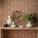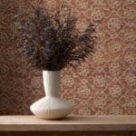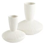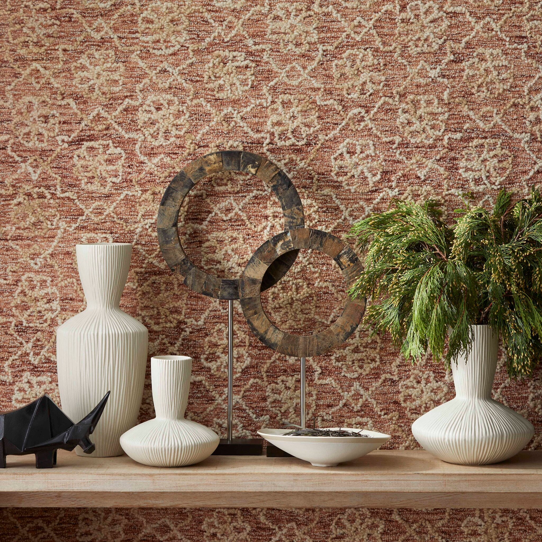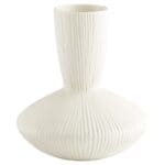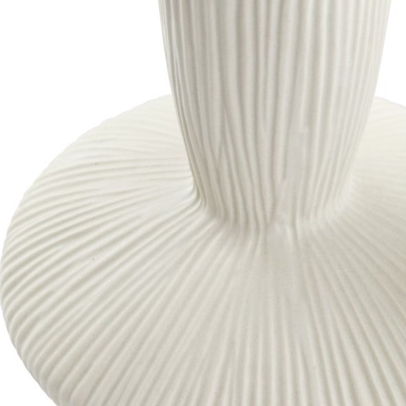 This vase possesses a compressed rigged body with a funnel-shaped neck. The curvaceous form is strikingly contrasted by the linear ridges which extend from the base to the neck. Accessorize with this modest, neutral, texturize vase. These are the perfect accessory for tabletops, bookshelves, and desks.