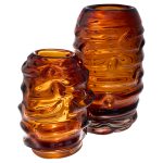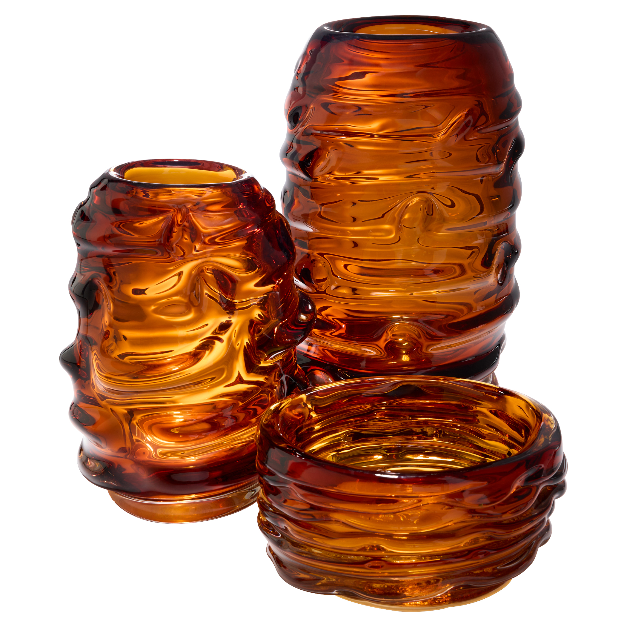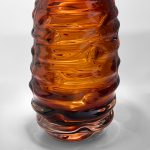 The vibrant color and fluid design of the Eocene Vases evoke the natural intensity of molten lava, creating a dynamic accent piece. With its substantial scale, heft, and organic form, these vases are crafted from thick amber glass, making them a striking addition to any space.