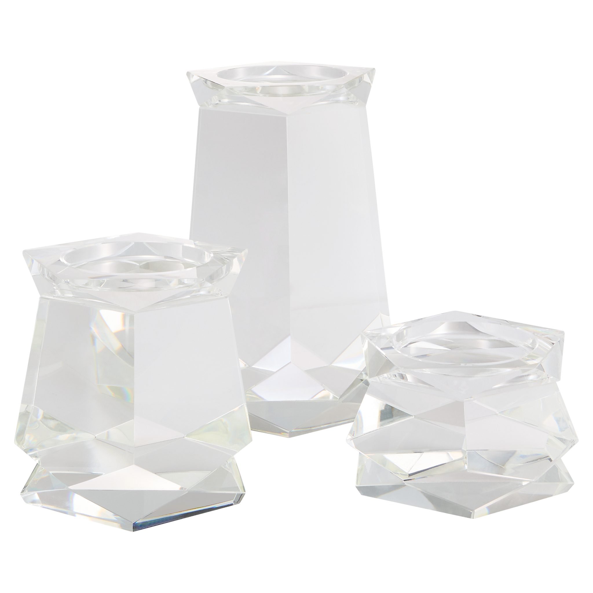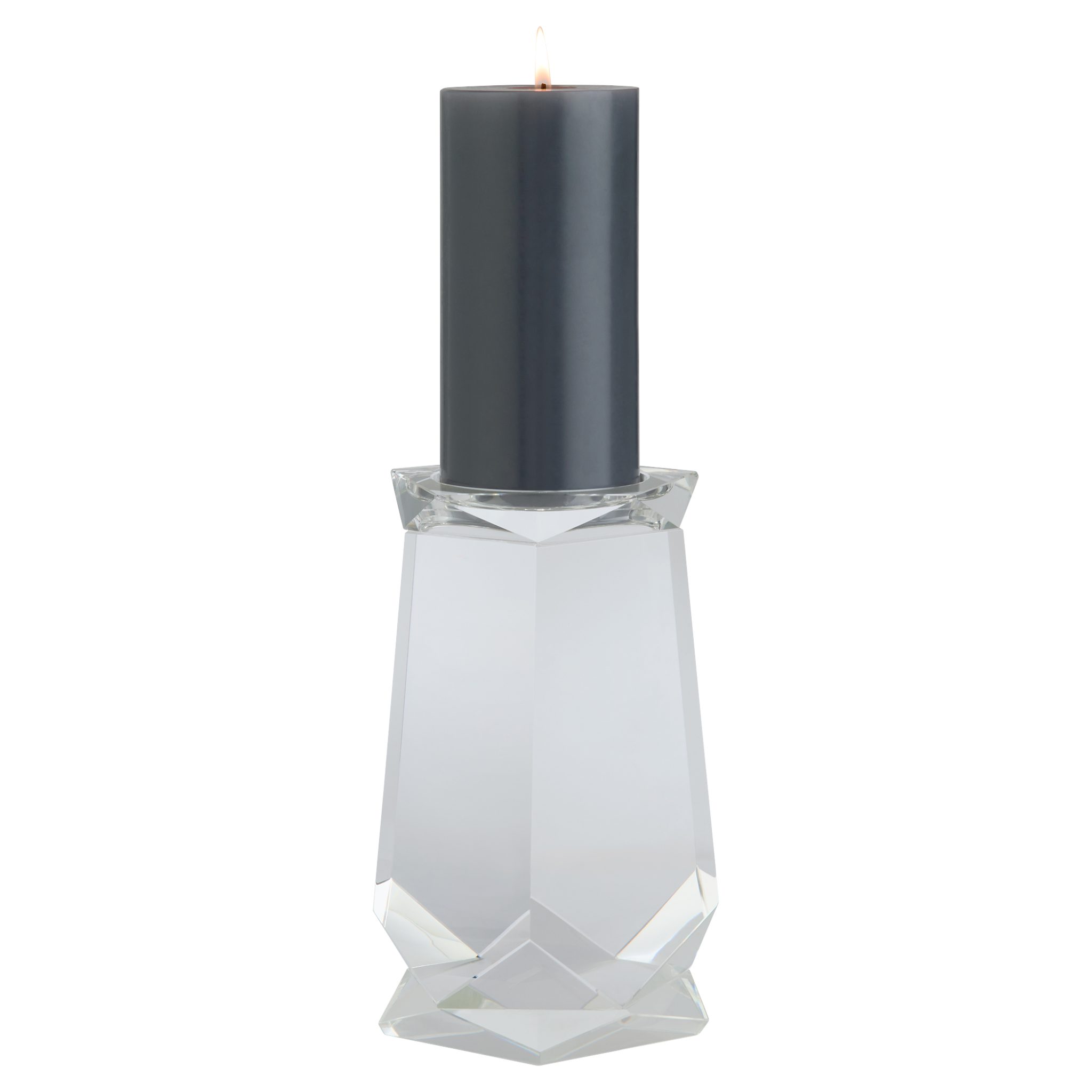 The Faceted Pillar Candleholders feature modern crystal with a bold scale and precise clarity. Its versatile design transitions effortlessly from formal to relaxed settings. Available in various shapes and sizes, it can be paired together for a bold presence or stand alone as an eye-catching accent.