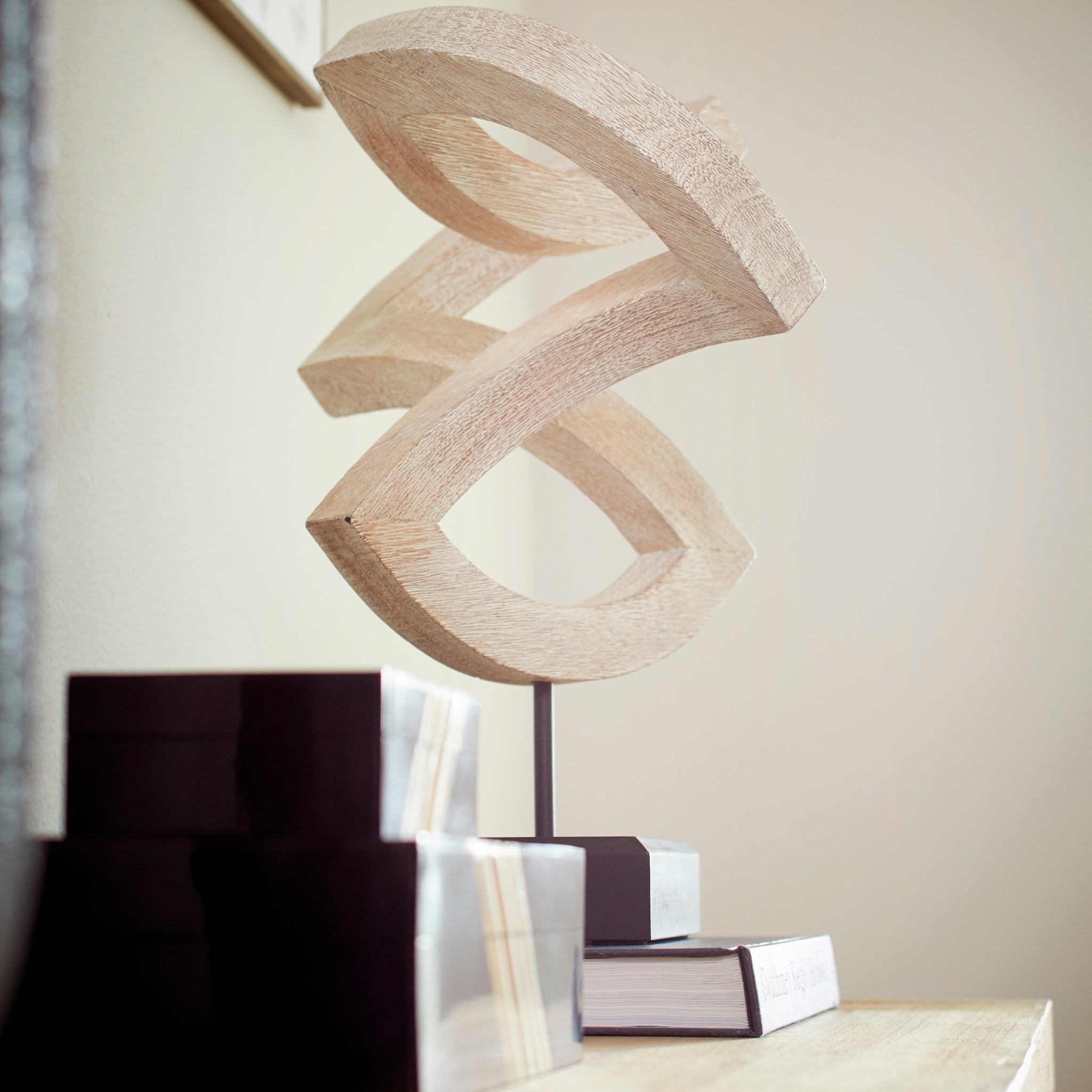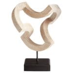 This is a bewildering floor standing sculpture that boasts an attractive natural wood grain that is certain to stun any and all that behold it. Its design is derived from the classic gestalt artistry and is a fitting inclusion to your home decor. This artful geometric looping design can instantly give any living room, entry way, dining room or office a stylish, natural artistic element. This neutral accent will easily complement any of your existing decorative accessories, but it will stand out from the rest.