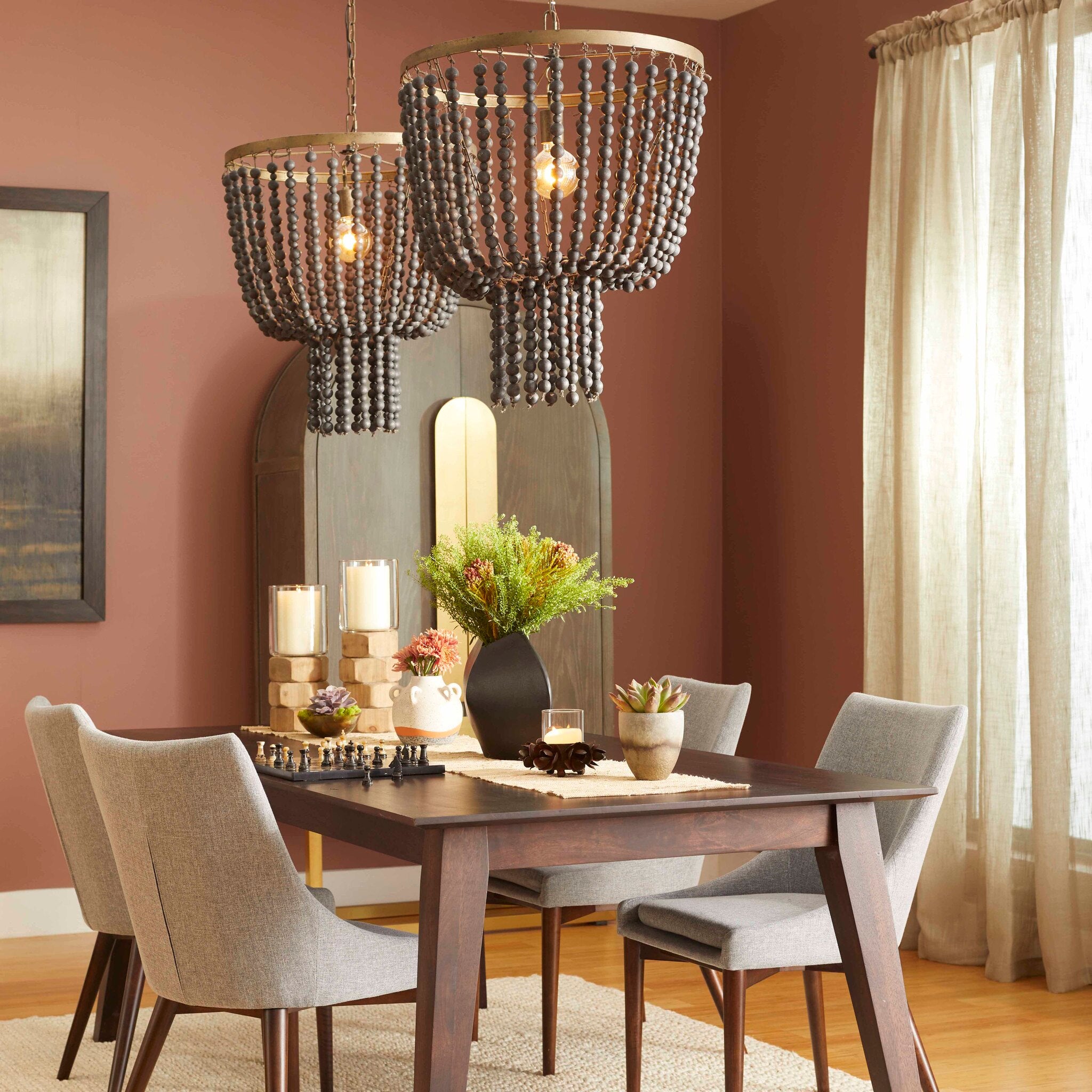 The Hammock Pendant light is petite and elegant. Its circular gilded frame provides support for dark monochrome beads, which elegantly gather at the base of the light, leaving a length to gracefully dangle underneath. This modest pendant light is perfect for smaller interior spaces or display in multiples.