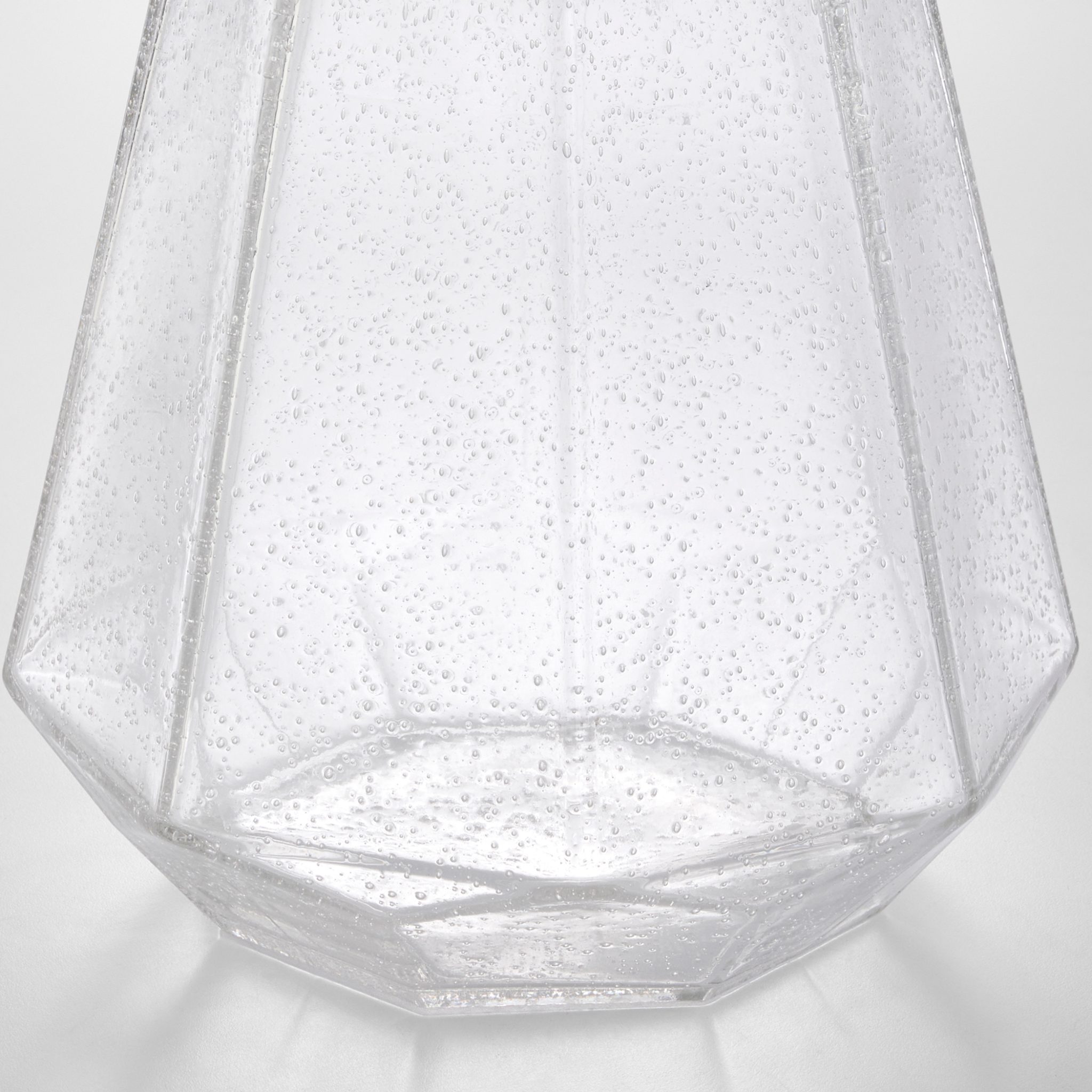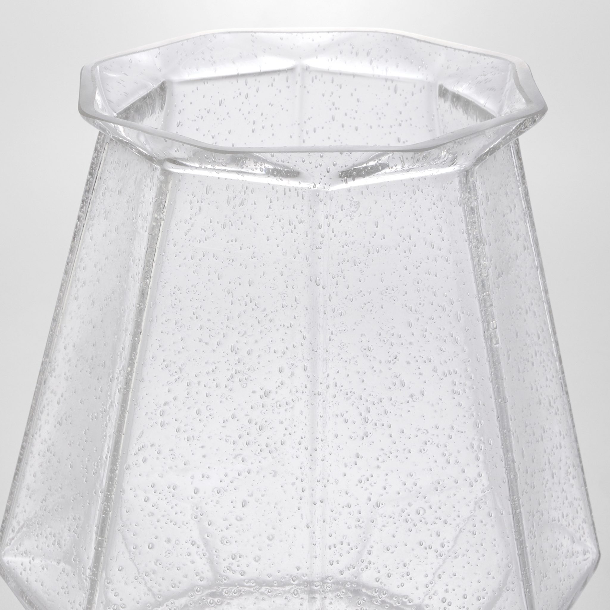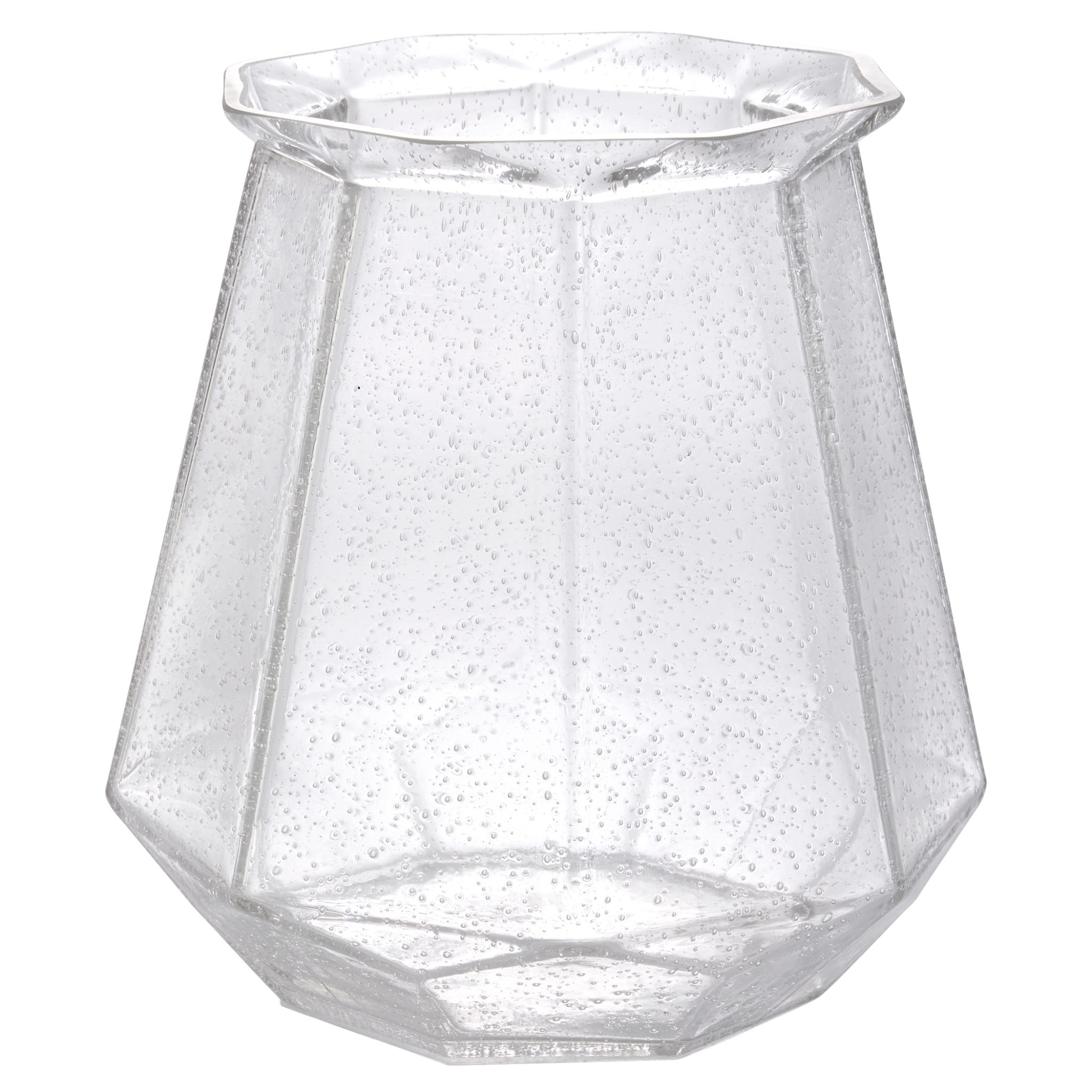 The Jager Vases showcase an elegant faceted design with a large, generous scale. The seeded glass texture adds depth and visual intrigue to the stunning piece.