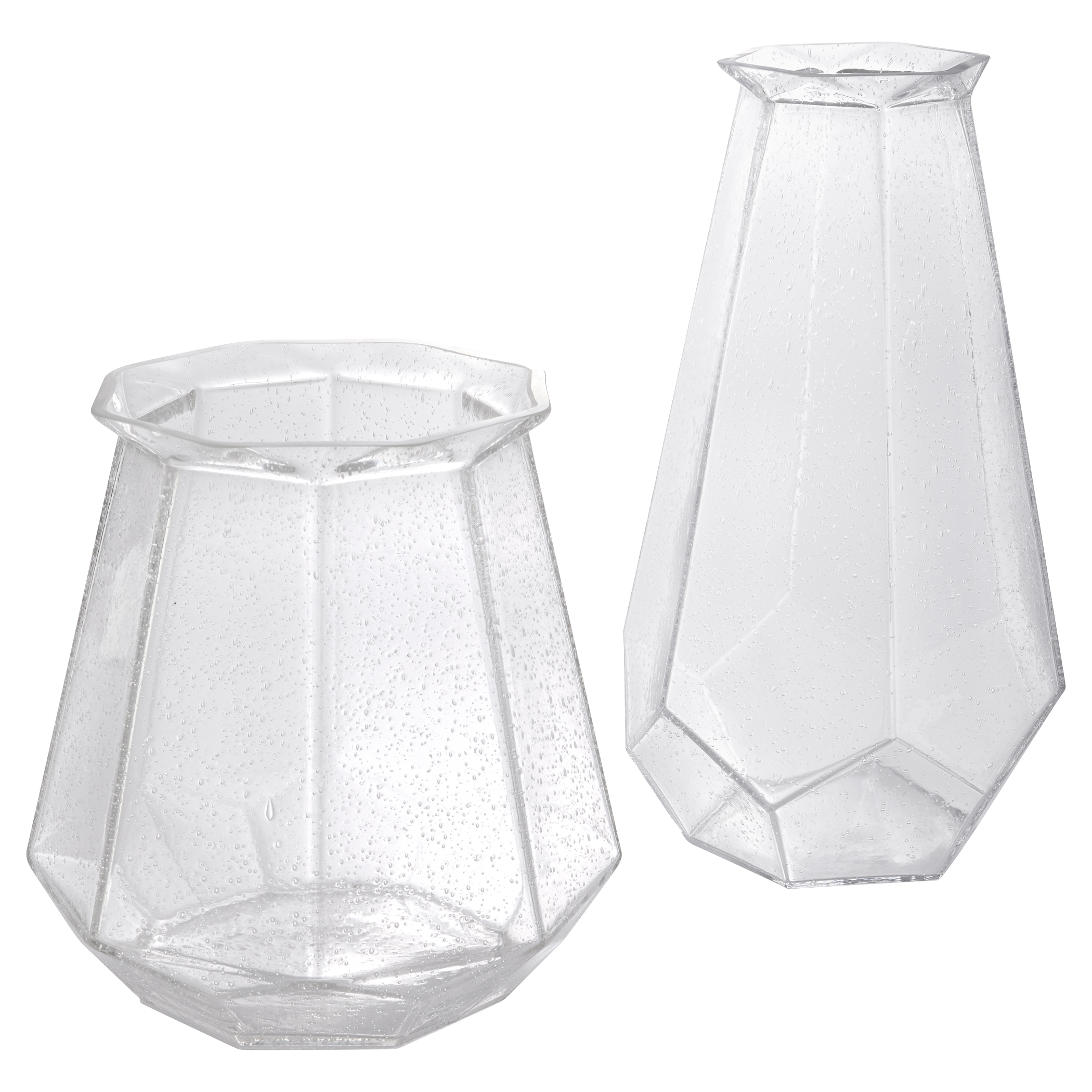 The Jager Vases showcase an elegant faceted design with a large, generous scale. The seeded glass texture adds depth and visual intrigue to the stunning piece.