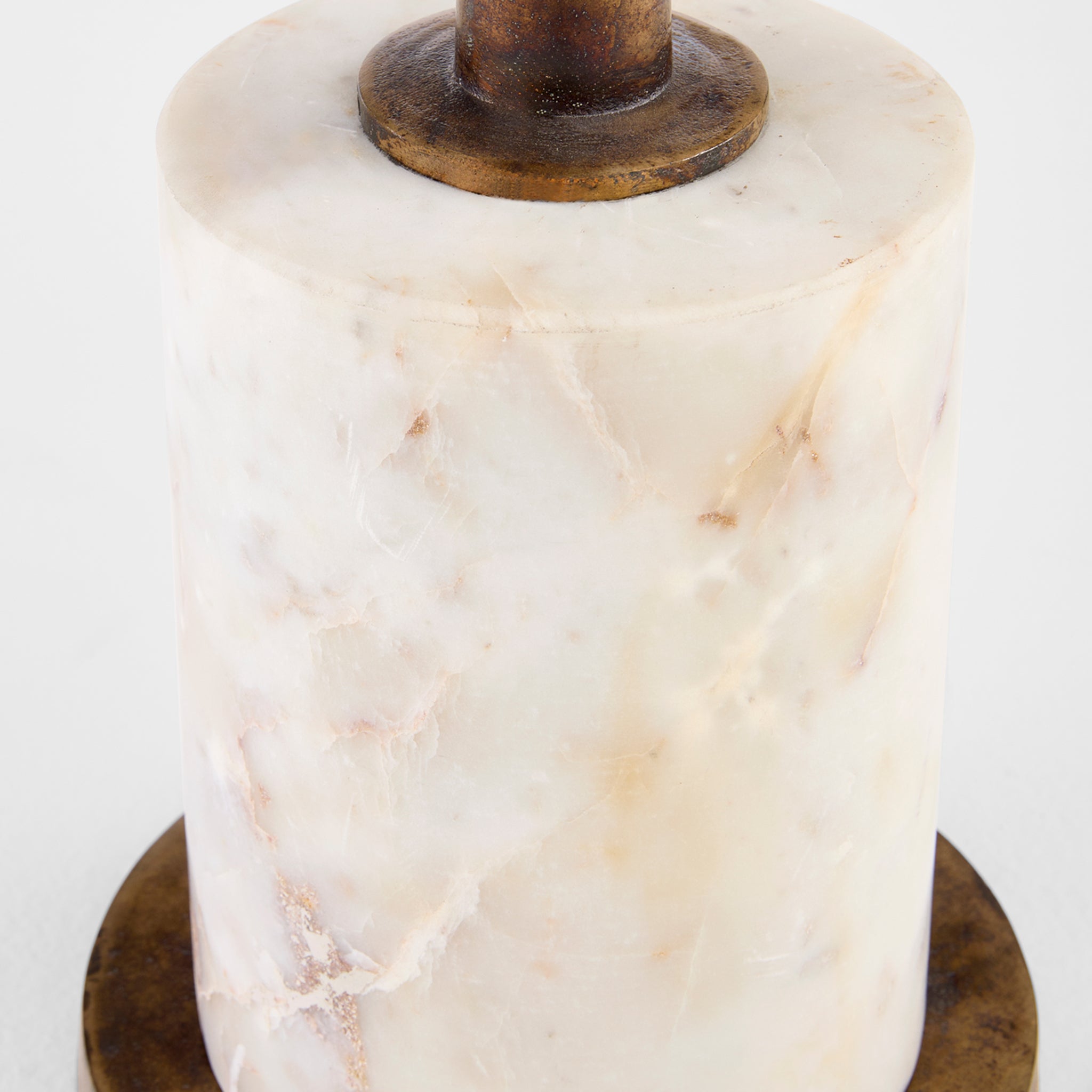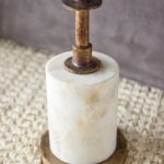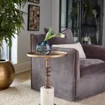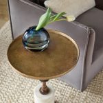The Jetson table’s rustic antique brass top and stem provide a striking contrast to a smooth, polished marble base. The table’s rough-cast tray top exudes a sense of tactile charm, invoking a handcrafted feel that’s both inviting and unique. Its heavy Banswara marble base not only provides stability but also enriches the table’s overall aesthetic appeal.