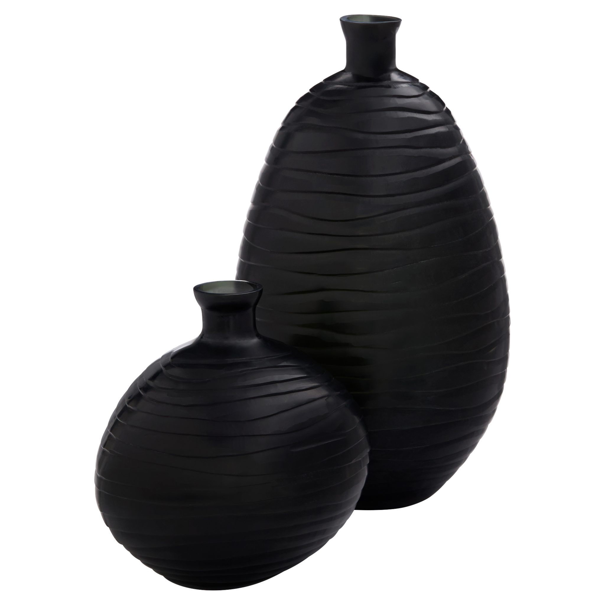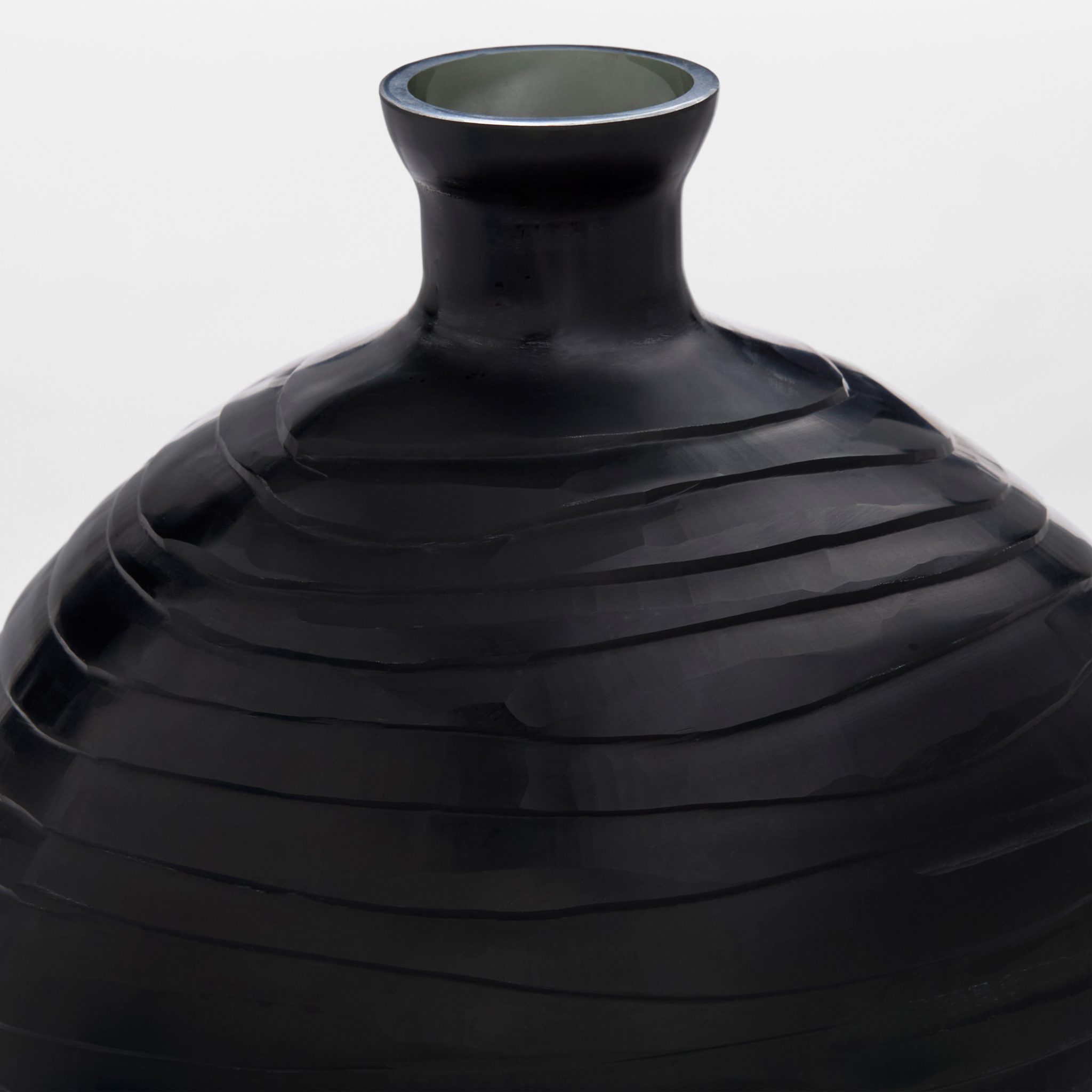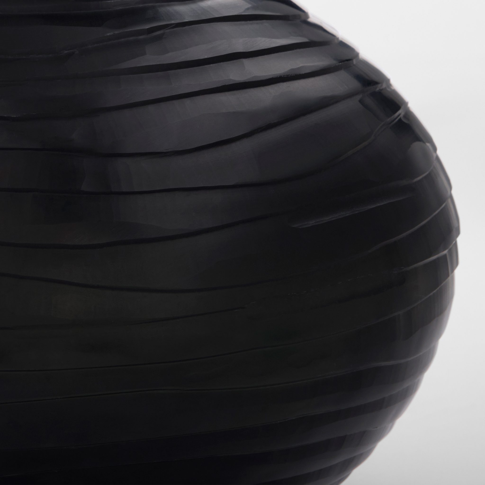 The Juniper Vases showcase a deep hunter-green hue, with ribbons of molten glass wrapped around the round shape. The overlapping layers create rich texture and depth through their irregular density. Designed in two sizes, they complement each other beautifully when put together.