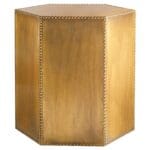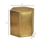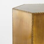 The Korio, or “honeycomb,” bunching table depicts the principles of geometry in form. With a hexagonal prism contour, the Korio table is best displayed in multiples to create the classic honeycomb shape. Brass sheet cladding is hammered by hand with miniature nailhead detailing, giving the table a stately overture.
