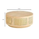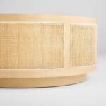 The Lamu series bears a distinct aesthetic reminiscent of a modern exotic retreat. Woven rattan cane panels are inset along the sides of this circular cocktail table. A plinthe base is complemented by the mitered concentric ring top. A warm natural oak finish completes the appeal of the Lamu cocktail table. Style your favorite books and accessories on top of the Lamu cocktail table to spark conversation in any living room or study.