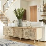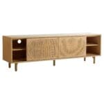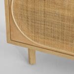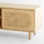 Woven rattan insets and natural oak finishes give the Lamu series a distinct aesthetic reminiscent of a modern exotic retreat. The media console within the series features three sliding doors that reveal an abundance of storage space with adjustable shelving. Its height is modest to accommodate for optimal viewing of large screens. Cutouts on the backside of the unit allow for discreet cable management for electronics. The signature rattan panels allow for remote signals to reach the consoles within without revealing the contents. Functionality, versatility, and style manifest in this attractive piece.