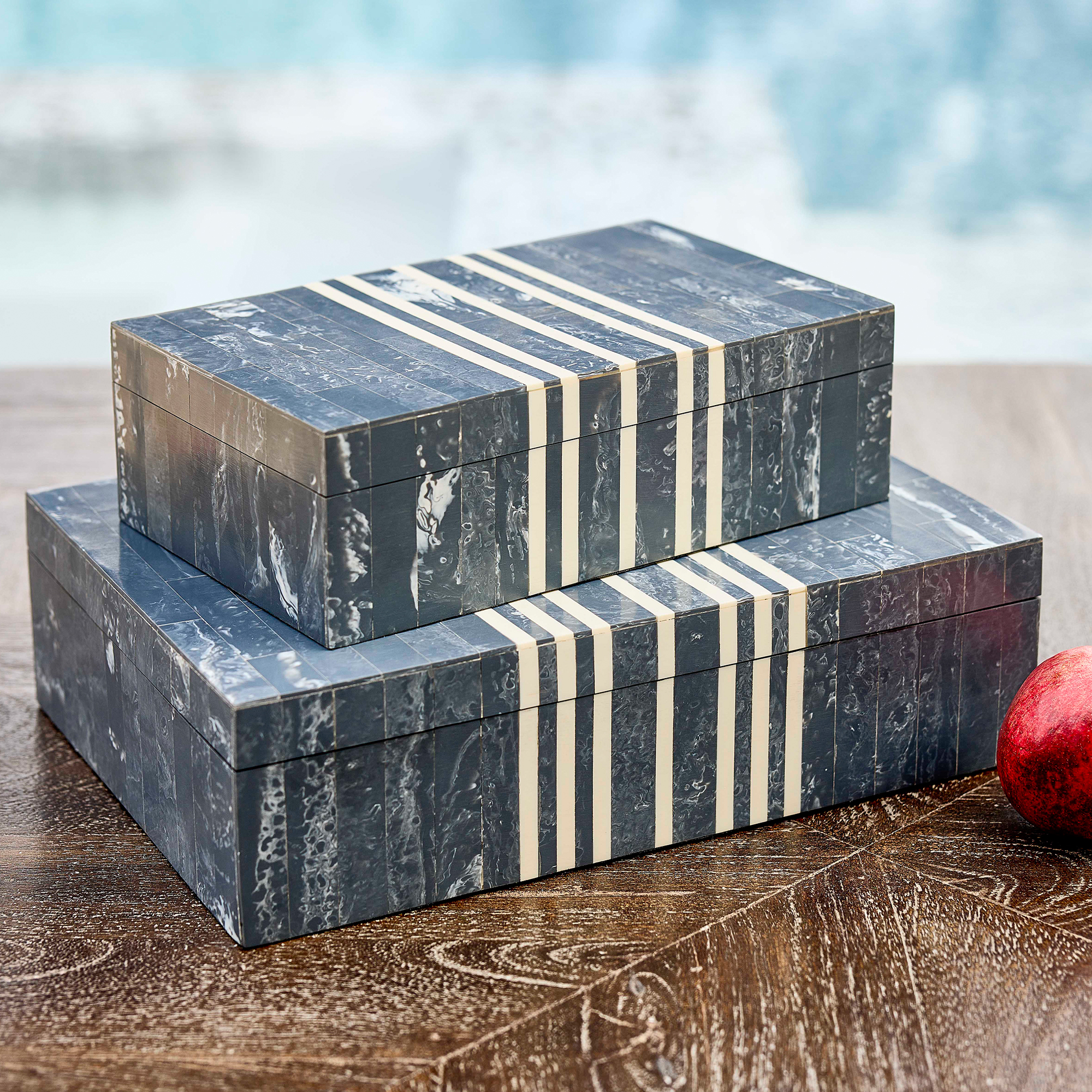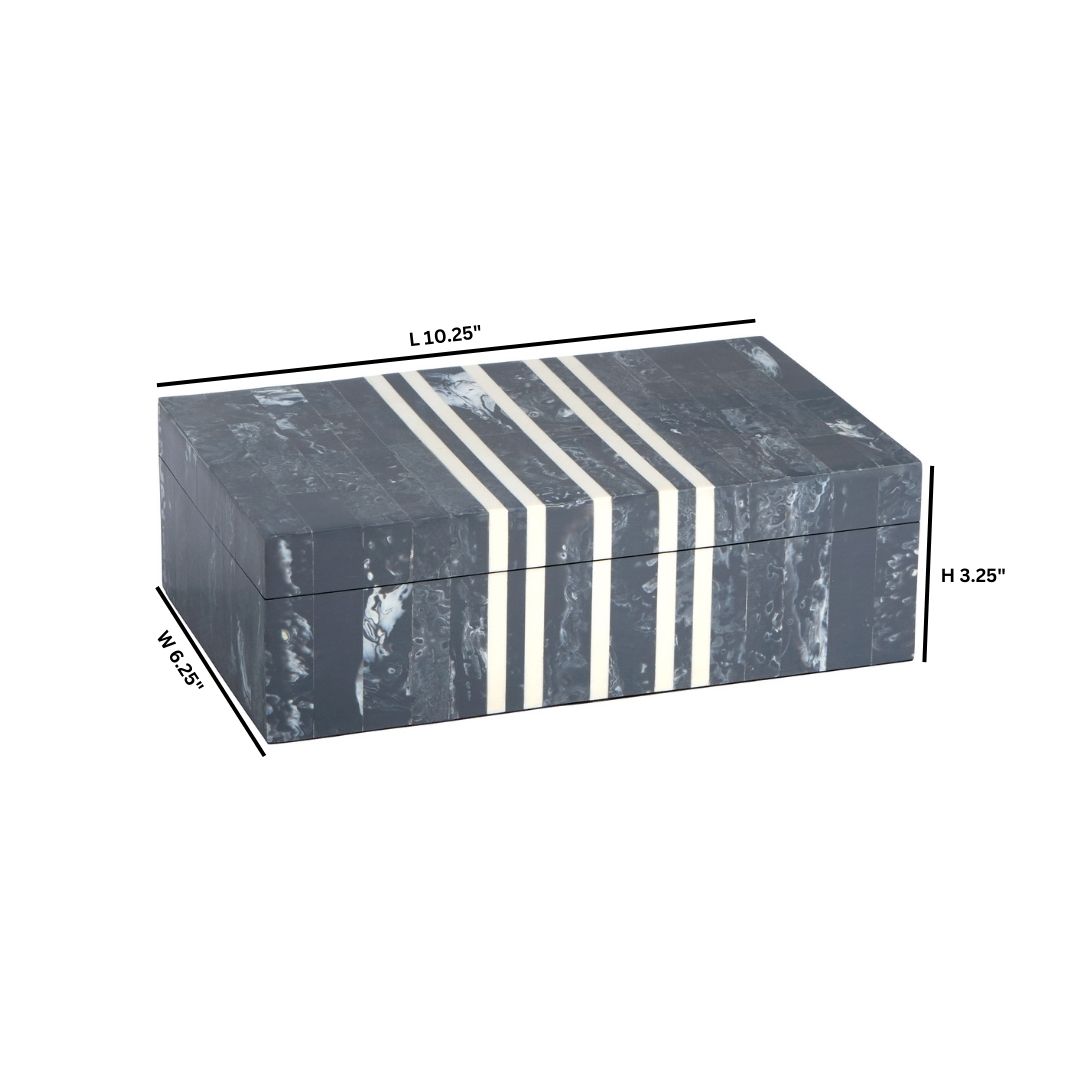 Crafted with care and precision, the Lapis Collection features boxes with hand-cut natural and faux bone pieces meticulously arranged to create striking patterns. While these boxes do not have hinges, each lid has stripes that perfectly match the box. The finished interior ensures every aspect is thoughtfully considered. These exquisite boxes showcase seamless craftsmanship and attention to detail. Available in two sizes.