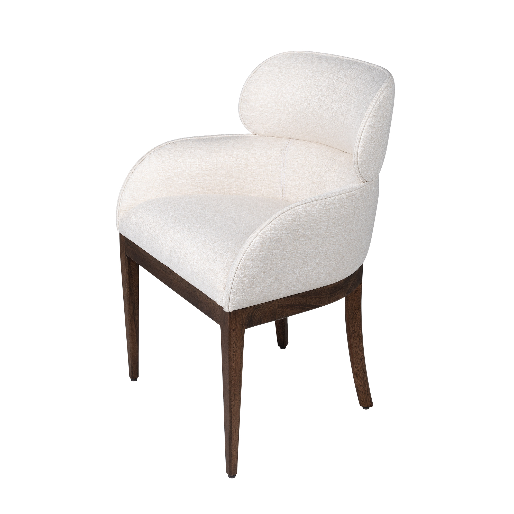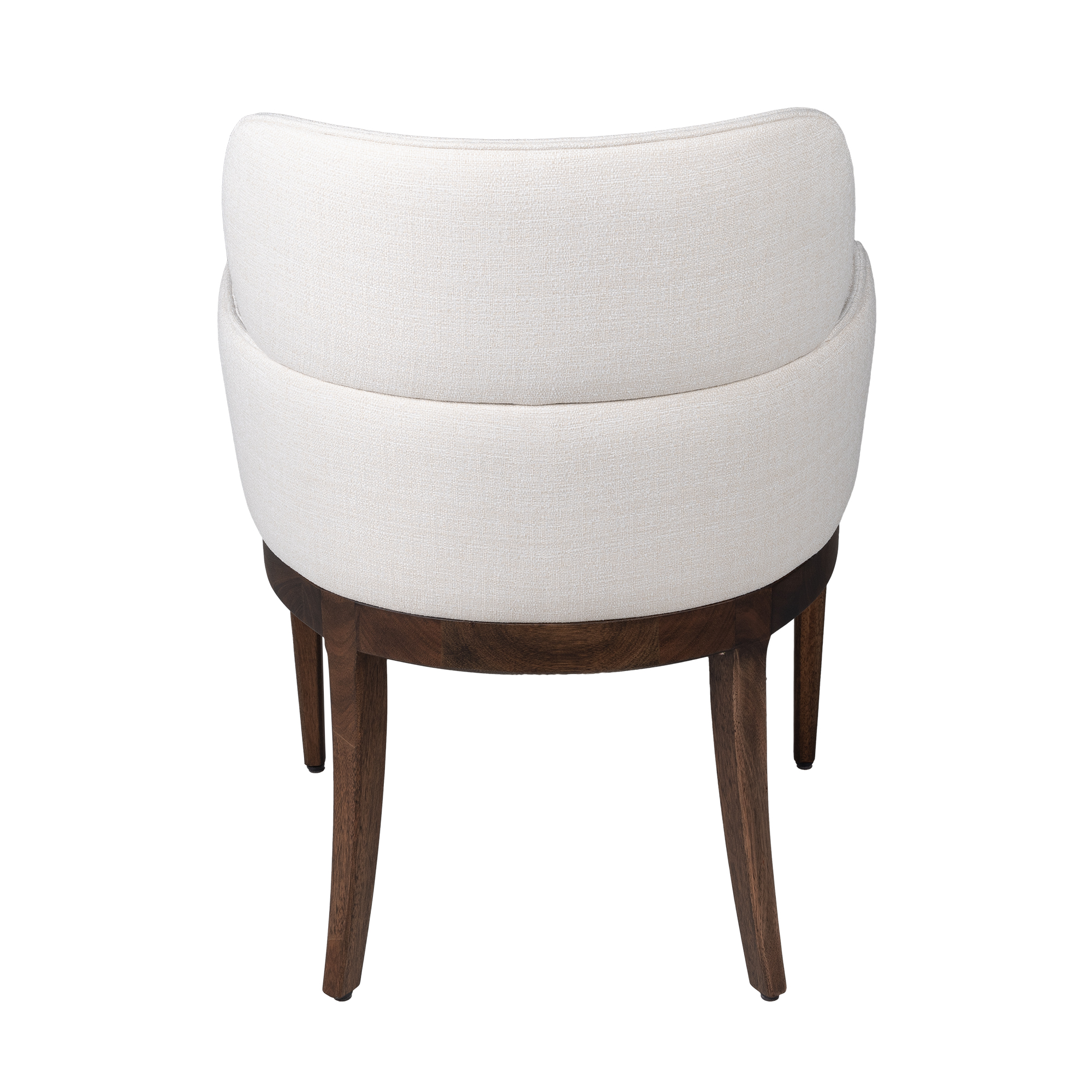 The Lucien dining chair features a reinforced frame of multi-laminated sheet metal, creating a curved two-tier shape for a distinctive, contemporary look. The seat is supported by a solid dark brown Grandis wood base. Upholstered in 100% polyester off-white chenille basket weave fabric, the chair provides comfort with D30 foam seats, making it a perfect addition to your dining area.
