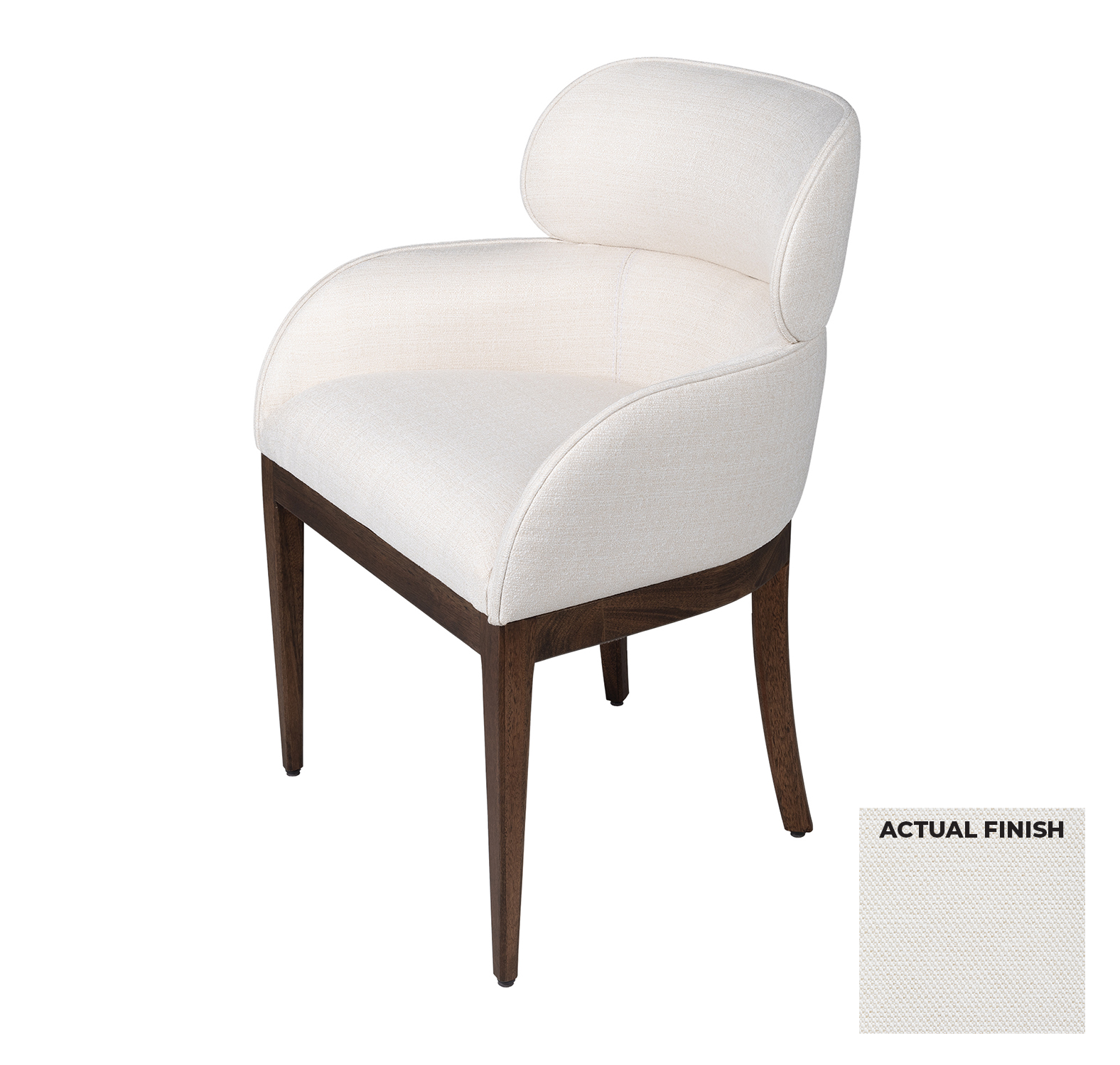 The Lucien dining chair features a reinforced frame of multi-laminated sheet metal, creating a curved two-tier shape for a distinctive, contemporary look. The seat is supported by a solid dark brown Grandis wood base. Upholstered in off-white geometric weave fabric, the chair provides comfort with D30 foam seats, making it a perfect addition to your dining area.