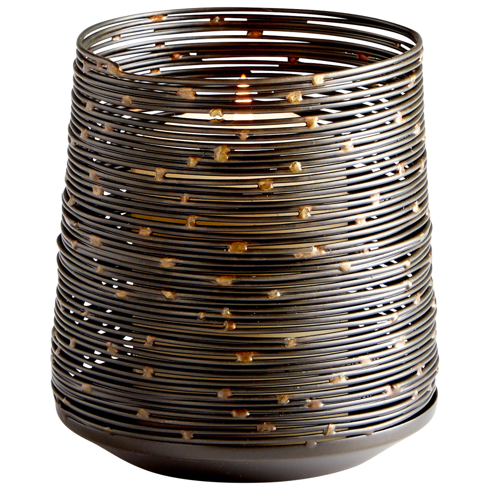 Wire-like bands circle this exceptional metal candleholder to provide a stylish glow from within. In an antique black finish, this medium holder is a charming addition to a living room mantel or end table.