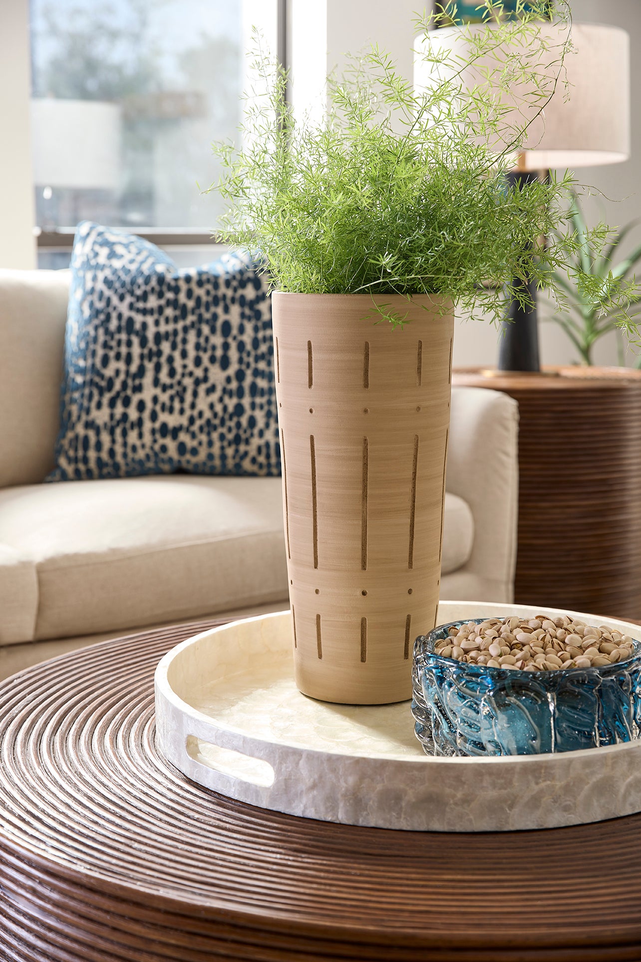 Slightly tapered cylinders feature hand-carved detailing in a warm terracotta finish in this hand-crafted collection of earthenware vases. Gentle striations subtly scrape the sides of the Madiera series as a finishing touch to pronounced dashes that are carefully etched by skilled artisans. Display the Madeira collection in an earthy color palette in any living area, dining or conversation room. Available in two sizes. Not water-tight.