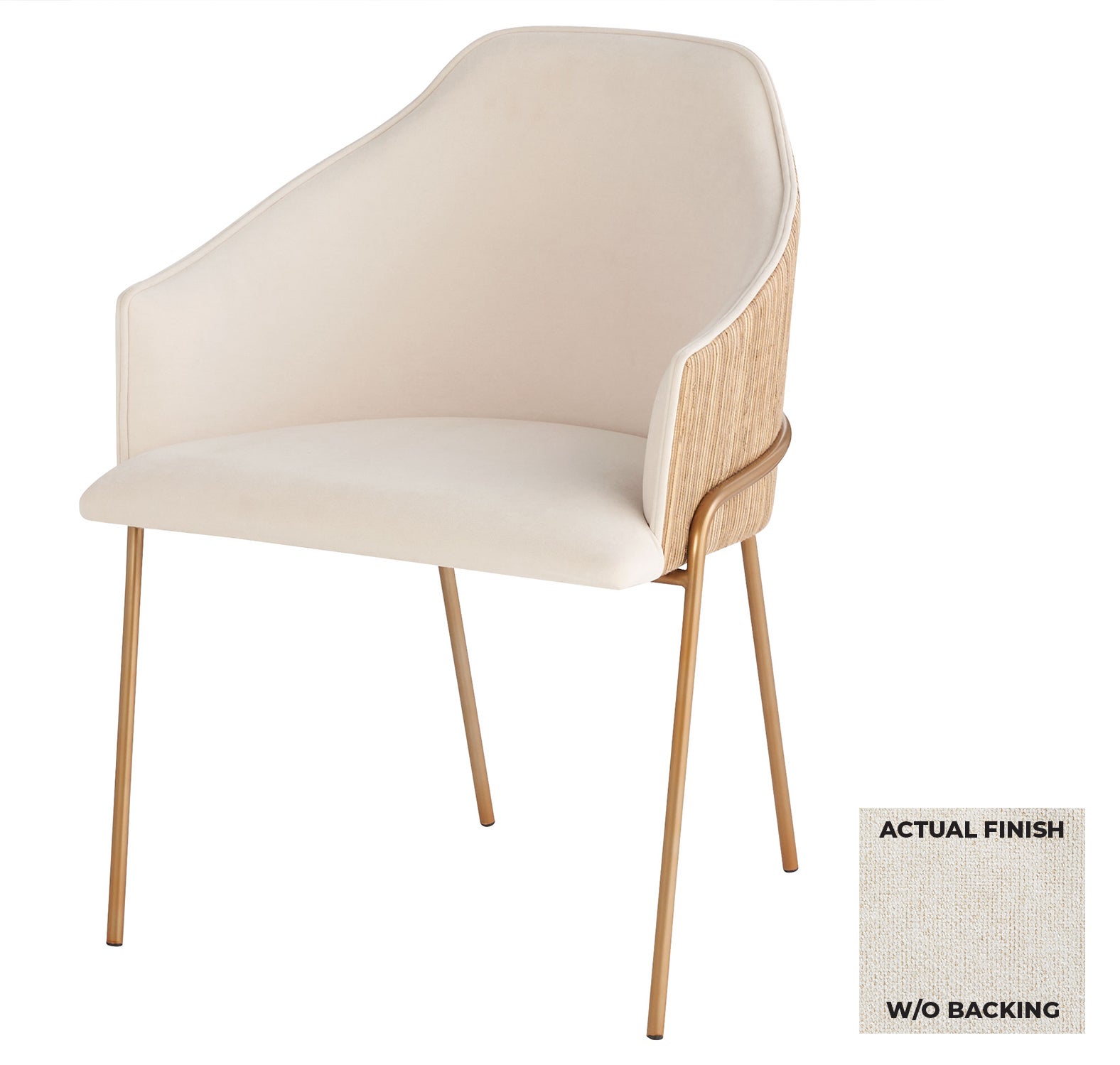 The Menfis dining chair’s seat is crafted from reinforced multi-laminated sheet metal, while the base is stainless steel finished in a brush gold. The back offers support to a tub-style seat with D26 foam upholstered in an off-white chenille basket weave, backed fabric, ensuring a cozy experience.