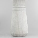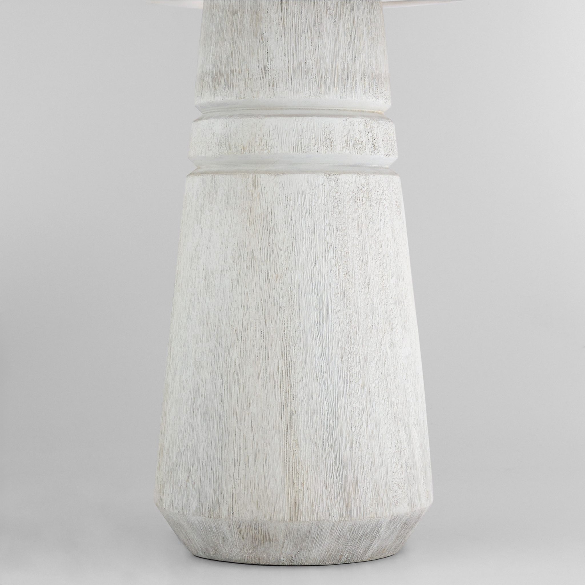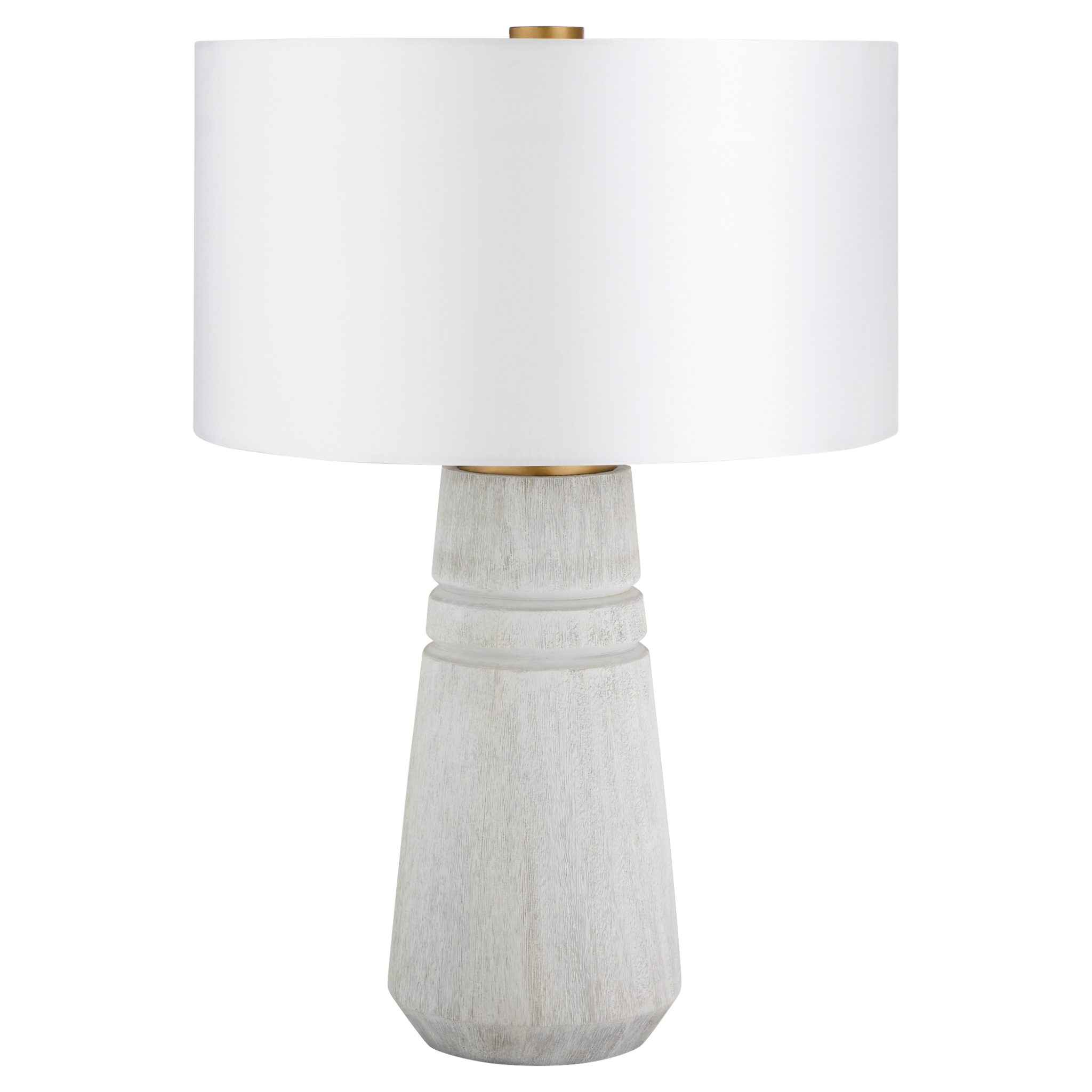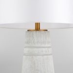 The Muller Table Lamp showcases antique brass accents, softened by a gray and white cerused ash body and a white linen shade, bringing a feminine elegance to any space.