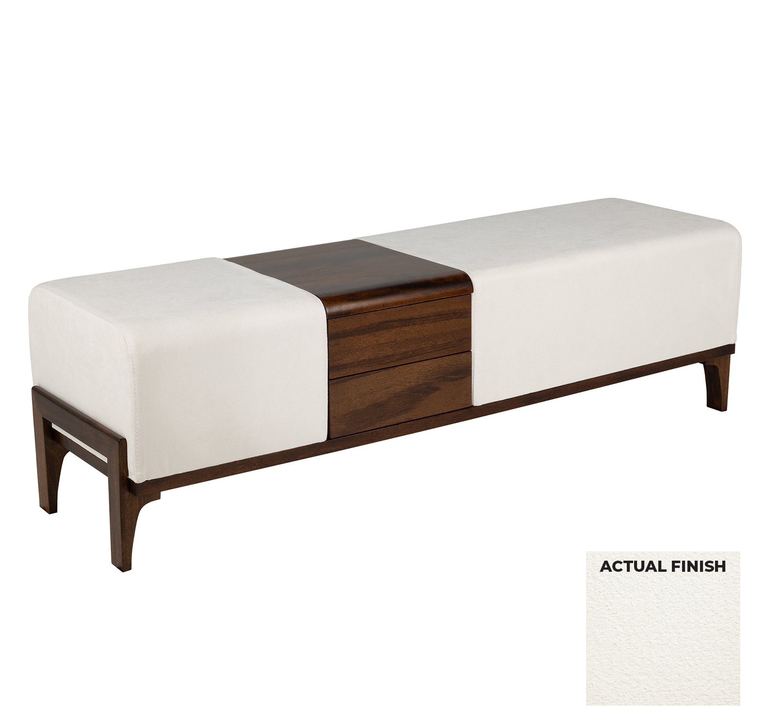 The Noah Bench, a remarkable piece in this collection, is constructed from solid Uraca wood and stands on triangle legs. Upholstered in an off-white boucle fabric, it offers both warmth and spirit. This multifunctional ottoman boasts two drawers with slides and a touch opening, adding practicality and organization to its elegance.