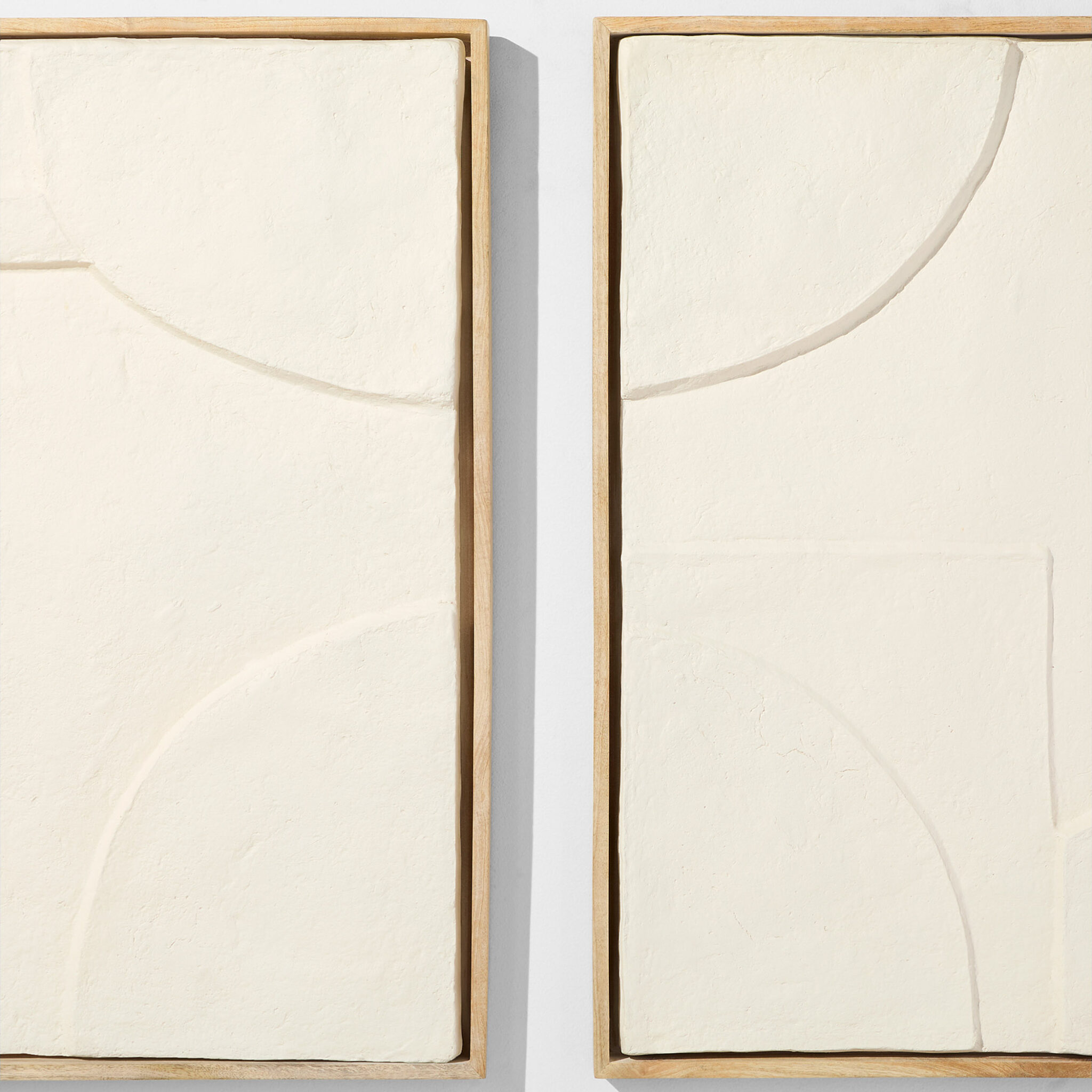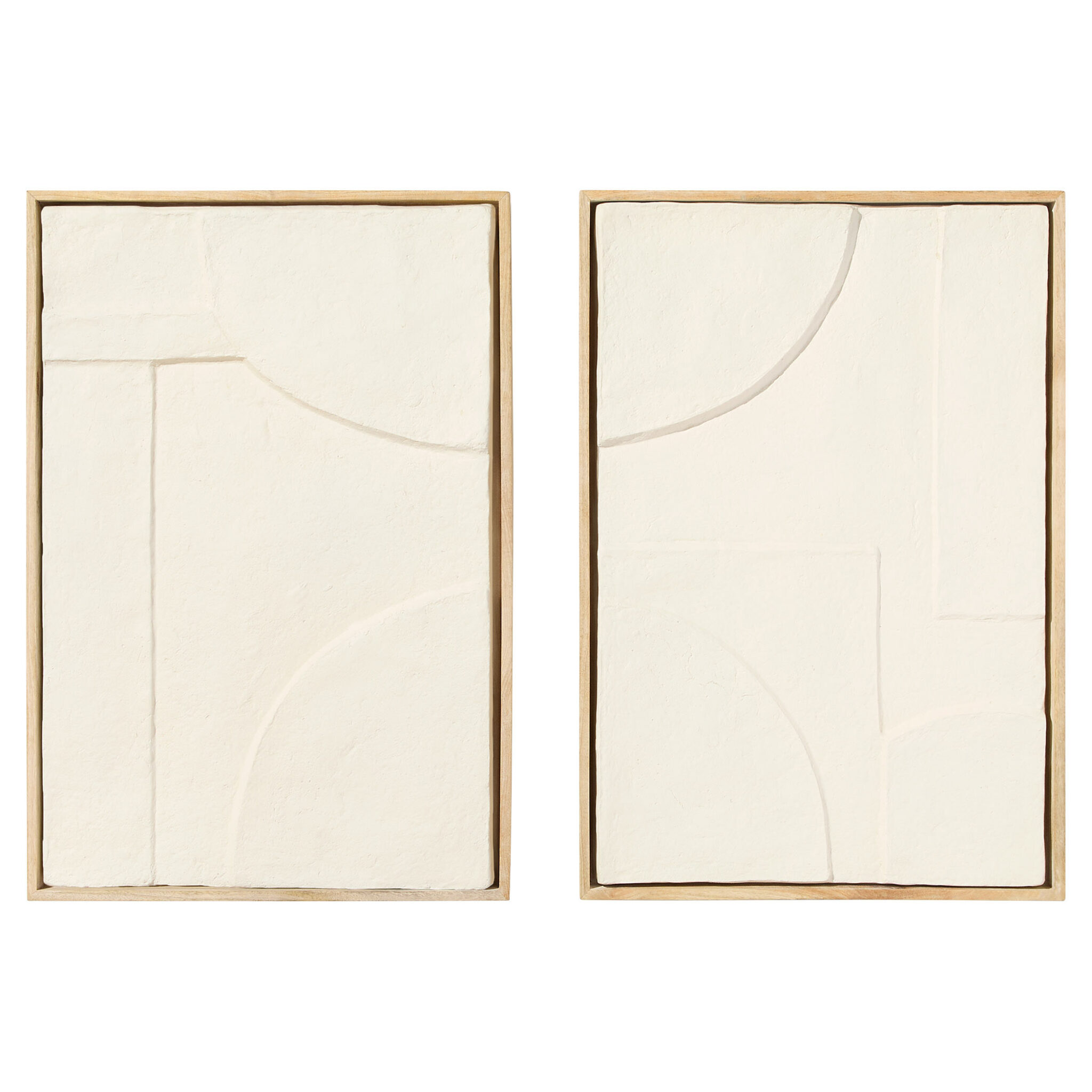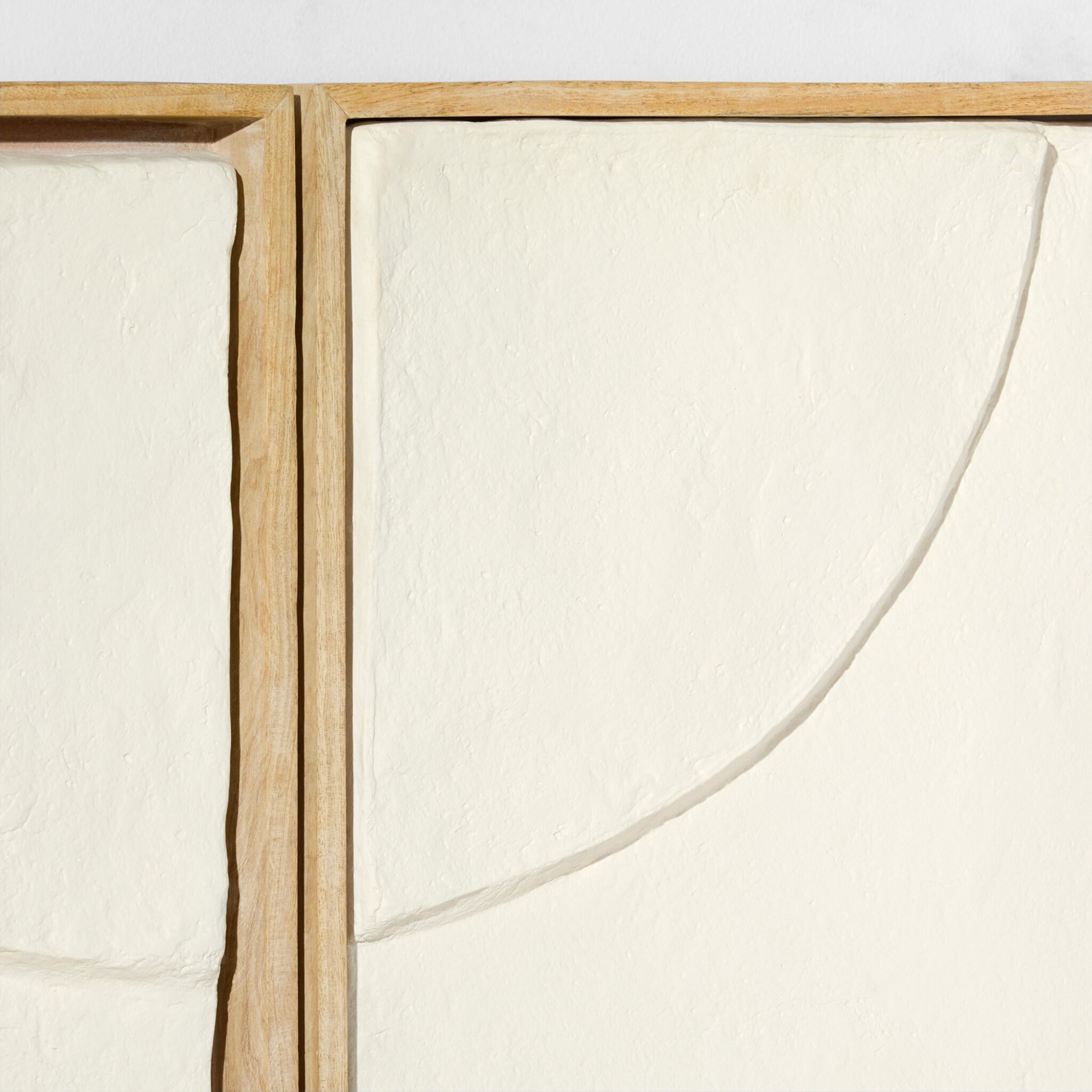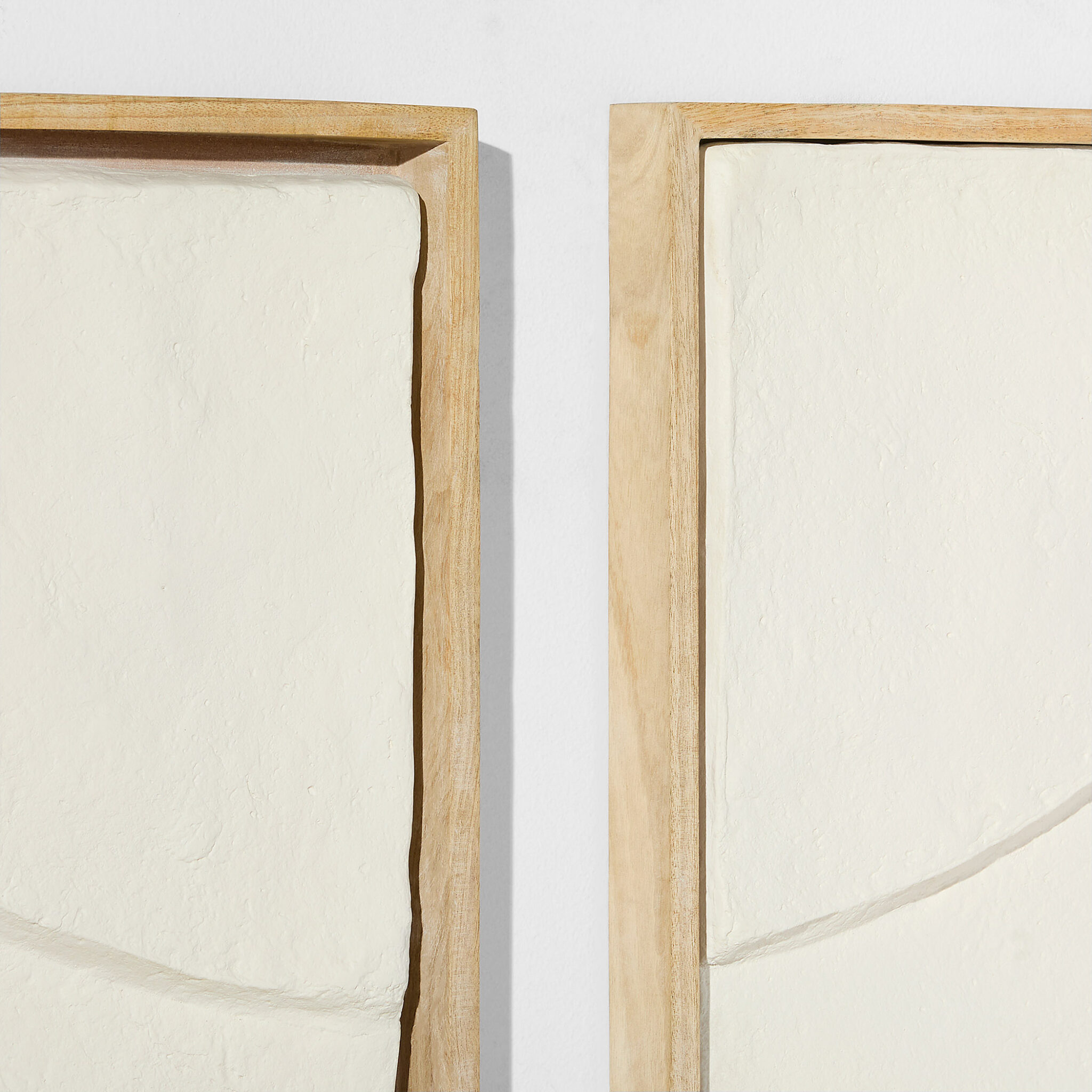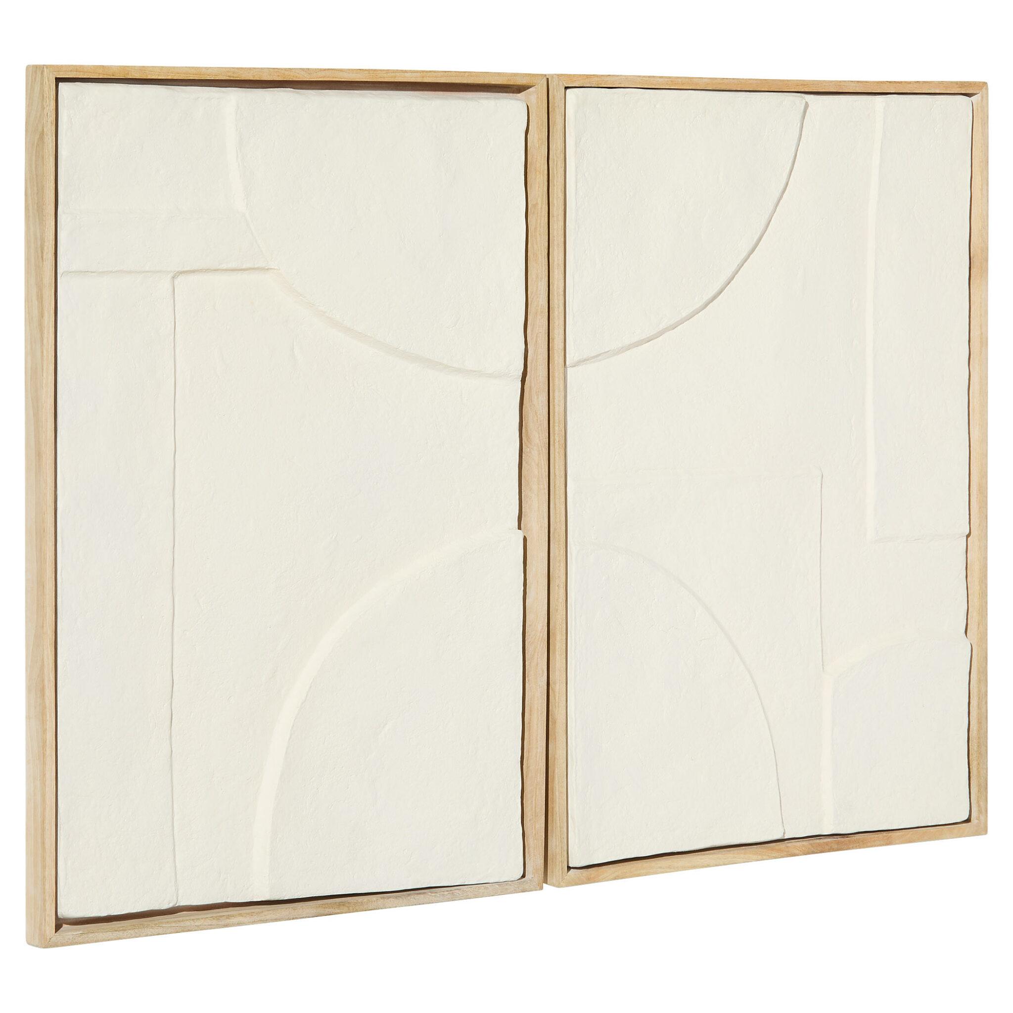 The Oliver Diptych Panels combine versatility, craftsmanship, and style. This set allows endless creative possibilities, as each panel can be hung in various orientations. Handcrafted with raised and carved design elements, these panels add remarkable depth. Framed in acacia wood, the natural tones harmonize beautifully with the off-white sustainable materials, delivering a balanced mix of texture and color.