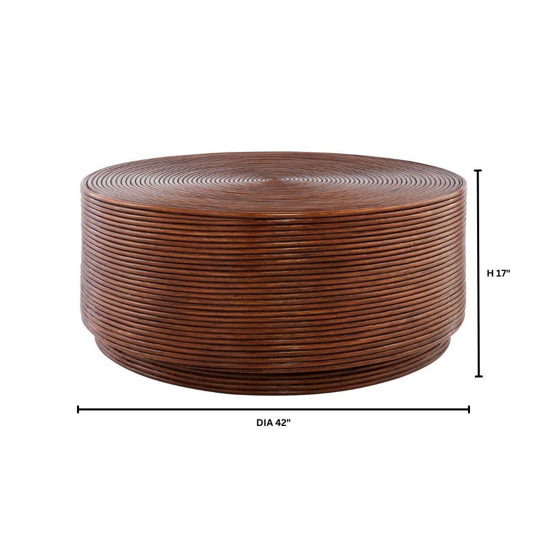 The Papeete Collection is a nod to the beauty of island life and the natural world. Named after the capitol of Tahiti, each piece within this collection features uniform walnut-stained rattan strands, tightly wound around an MDF substrate form and then coiled onto the top of the design. This intricate technique reflects the skill and dedication of Philippine artisans who handcraft these unique pieces. A walnut-stained recessed plinthe creates a cohesive design that resonates with the spirit of nature. This cocktail table is an artistic representation of the beauty of tropical life.