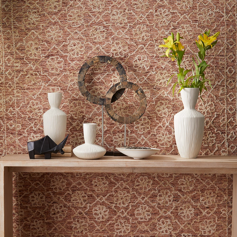 Evoke daydreams of transport to a new dimension with this large wood sculpture. Featuring an understated stand and stainless steel accent finish, the sculpture boasts a sleek open ring with a mottled brown finish offering depth and dimension.
