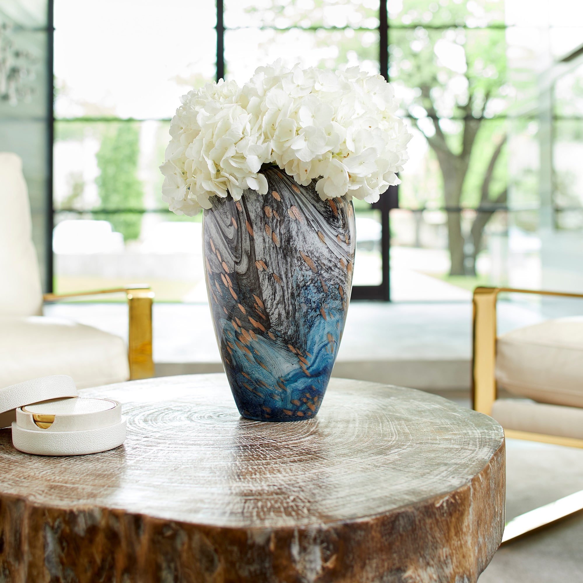 Color can make your space stand out, especially when displayed in unique patterns and formations. For this reason, the Prismatic tabletop vase is sure to add an instant boost to your design plans. Coated in a stunning multicolored gradient finish, this bud-shaped vessel showcases blue, green, grey, and gold splashes. Available in three size options, these rounded vases can create a head-turning display on your dining room table, living room coffee table, or any office bookshelf display.