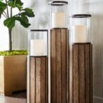 The Reed series of hurricane lamps make a dramatic statement as individual pieces or grouped in multiples. Three sizes of weathered Mango wood columns are adorned with solid brass strips that are inserted into grooves along the body of the base. Brass detailing and rimmed candle platform are finished in oiled bronze. The series can be adapted for tabletop display indoors or underneath a covered outdoor area.