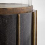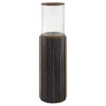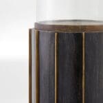 The Reed series of hurricane lamps make a dramatic statement as individual pieces or grouped in multiples. Three sizes of dark brushed mango wood columns are adorned with solid brass strips that are inserted into grooves along the body of the base. Brass detailing and rimmed candle platform are finished in antique brass. The series can be adapted for tabletop display indoors or underneath a covered outdoor area.