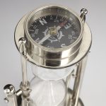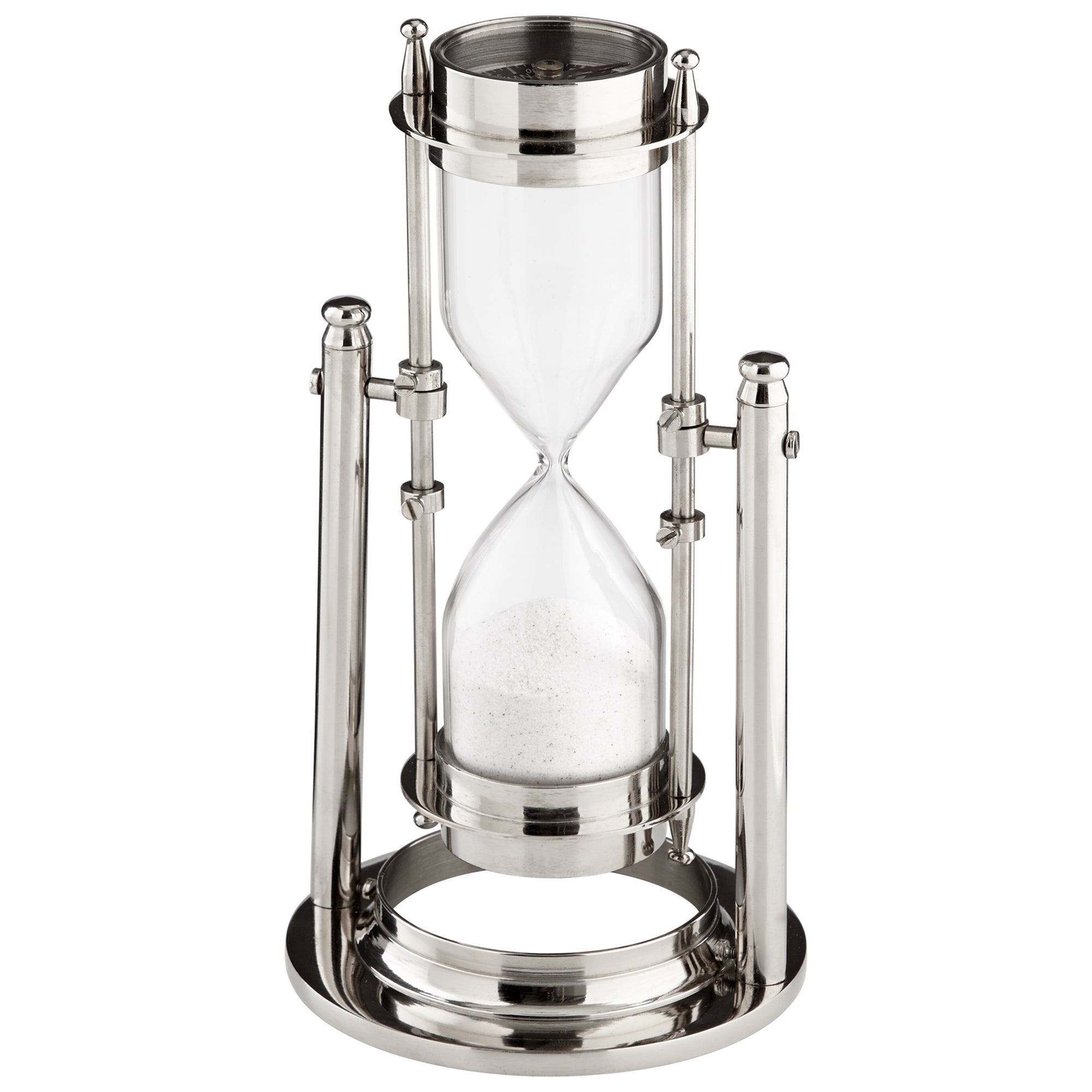 Honor the passage of time with this functional Sands of Time sculpture. A classic sand-filled hourglass rests with a nickel finish frame allowing for 180-degree rotation to mark the passage of time.