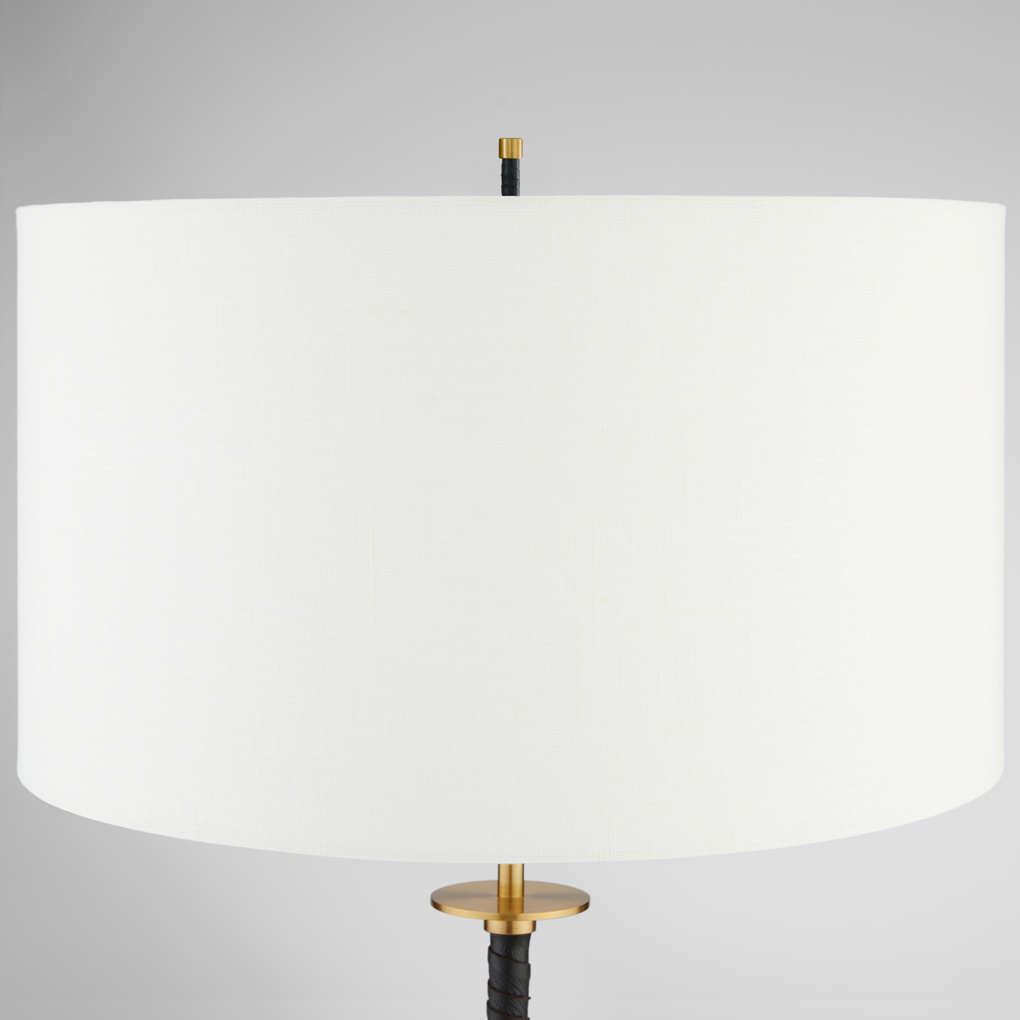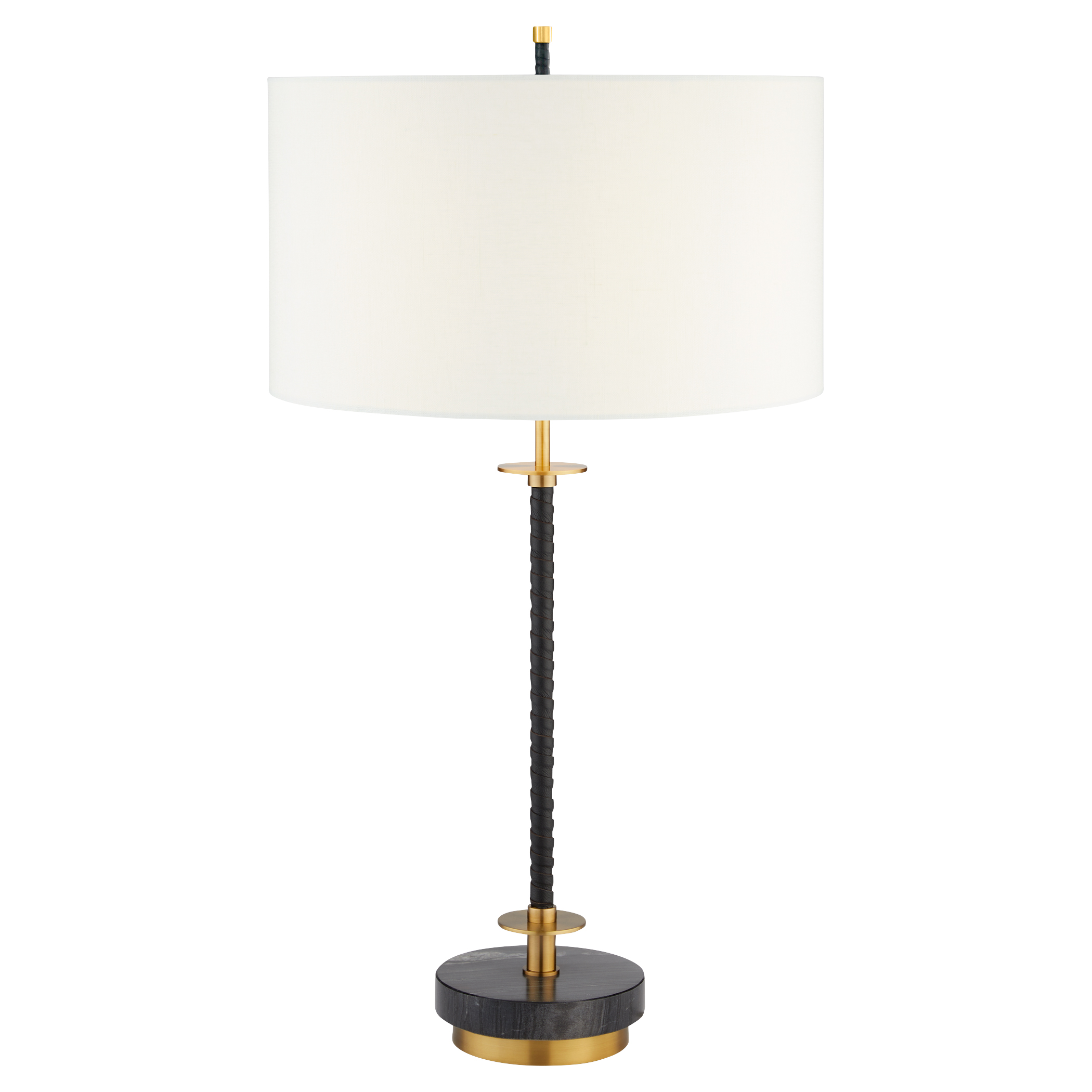 The Santiago Table Lamp combines understated style with sophistication with its Bheslana marble base and brass accents. The black leather-wrapped finial adds elegance, while the white linen shade completes the refined design.