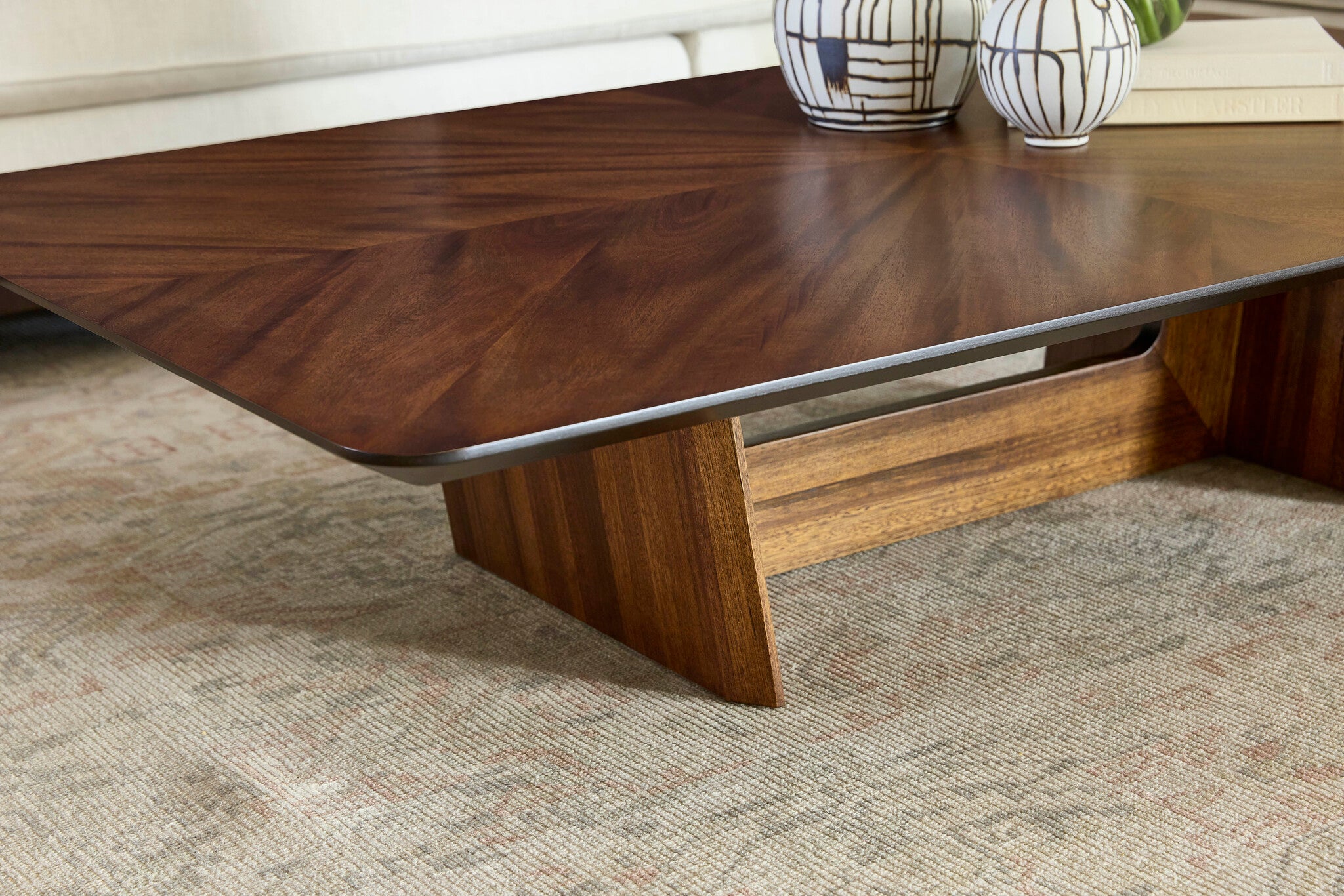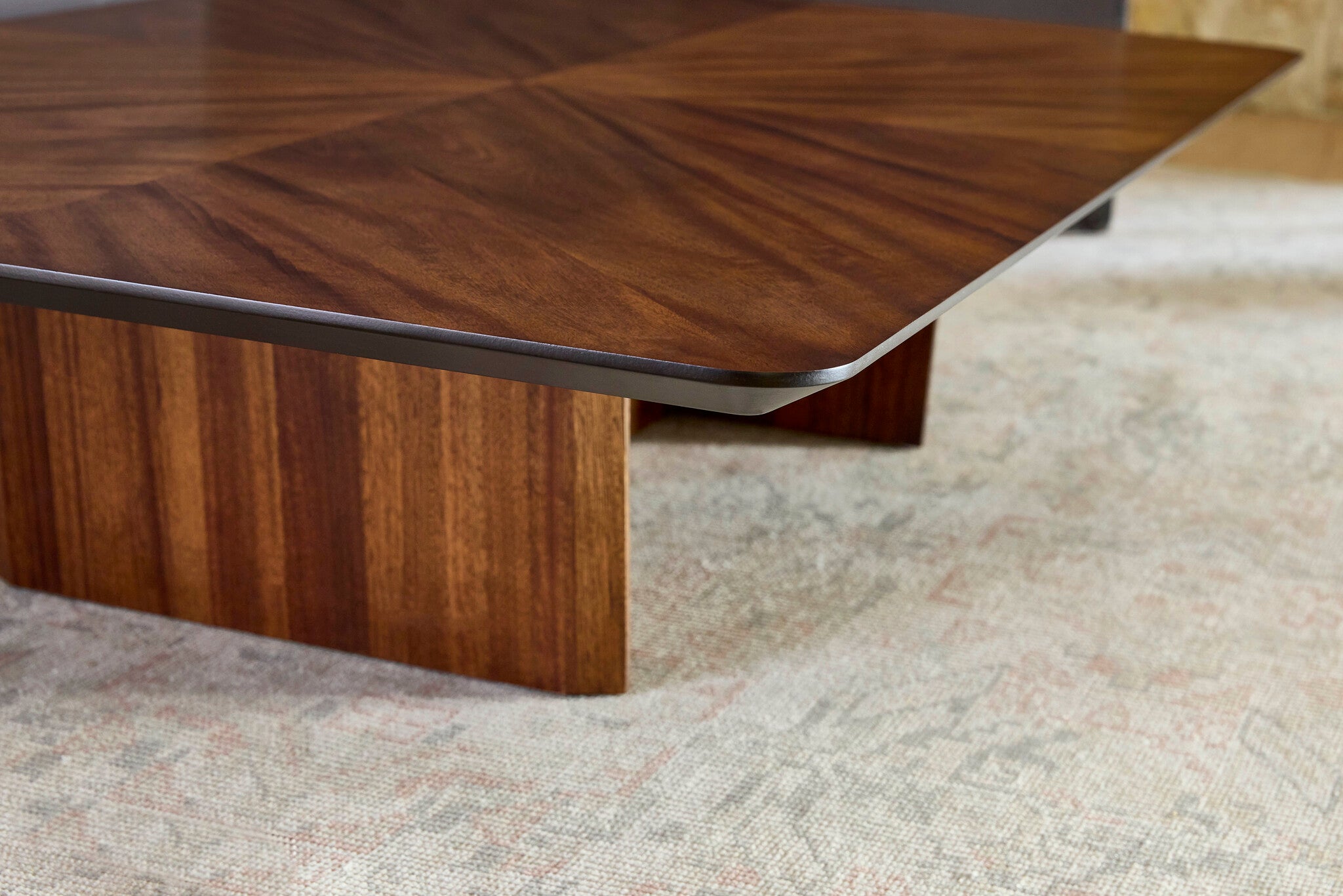 The Soul cocktail table, a standout within the Elevar collection, showcases a Grandis veneer top adorned with Uraca leaf marquetry in an exquisite pattern. This Mid-Century Modern-inspired oversize cocktail table features a recessed tressel-style base constructed of solid Grandis wood.