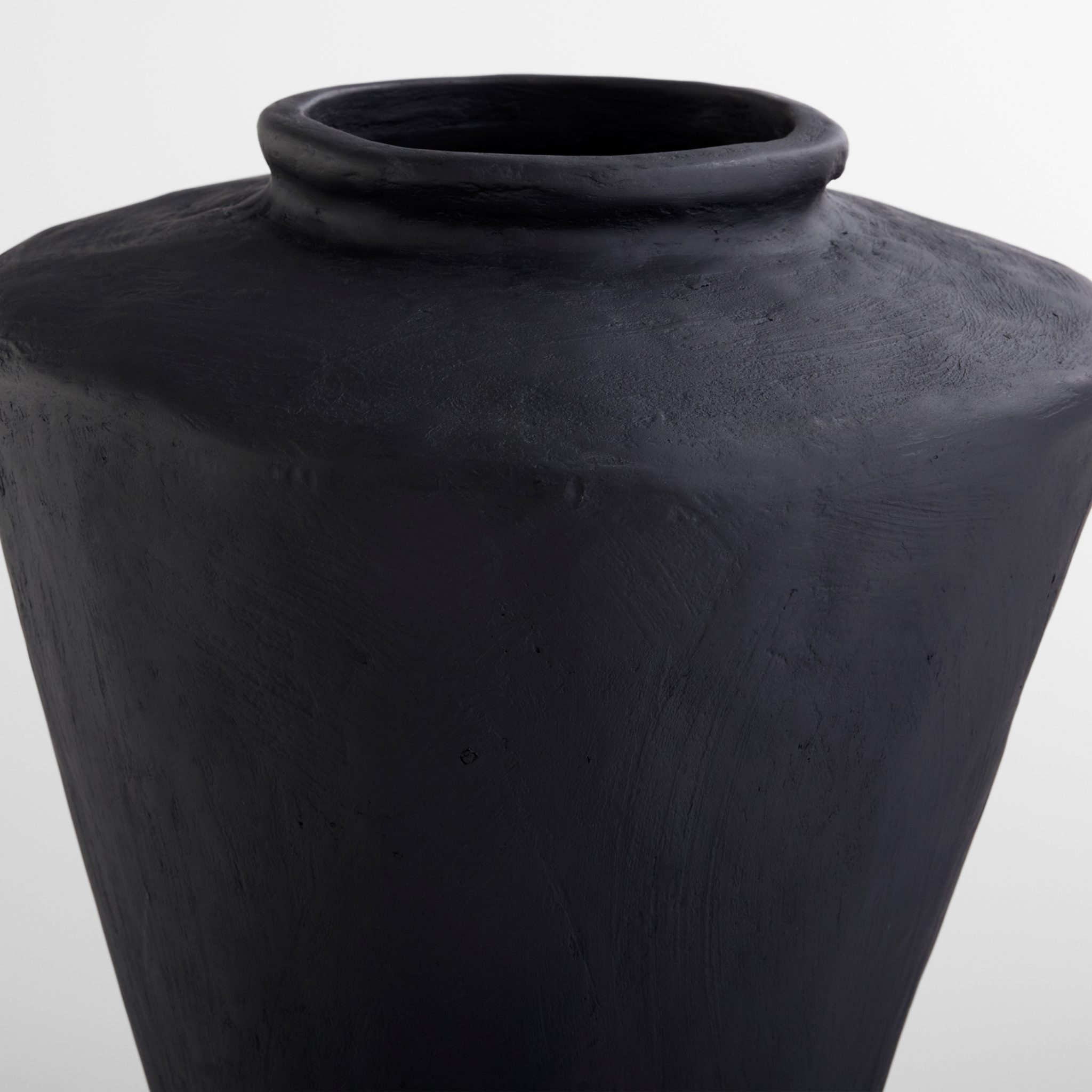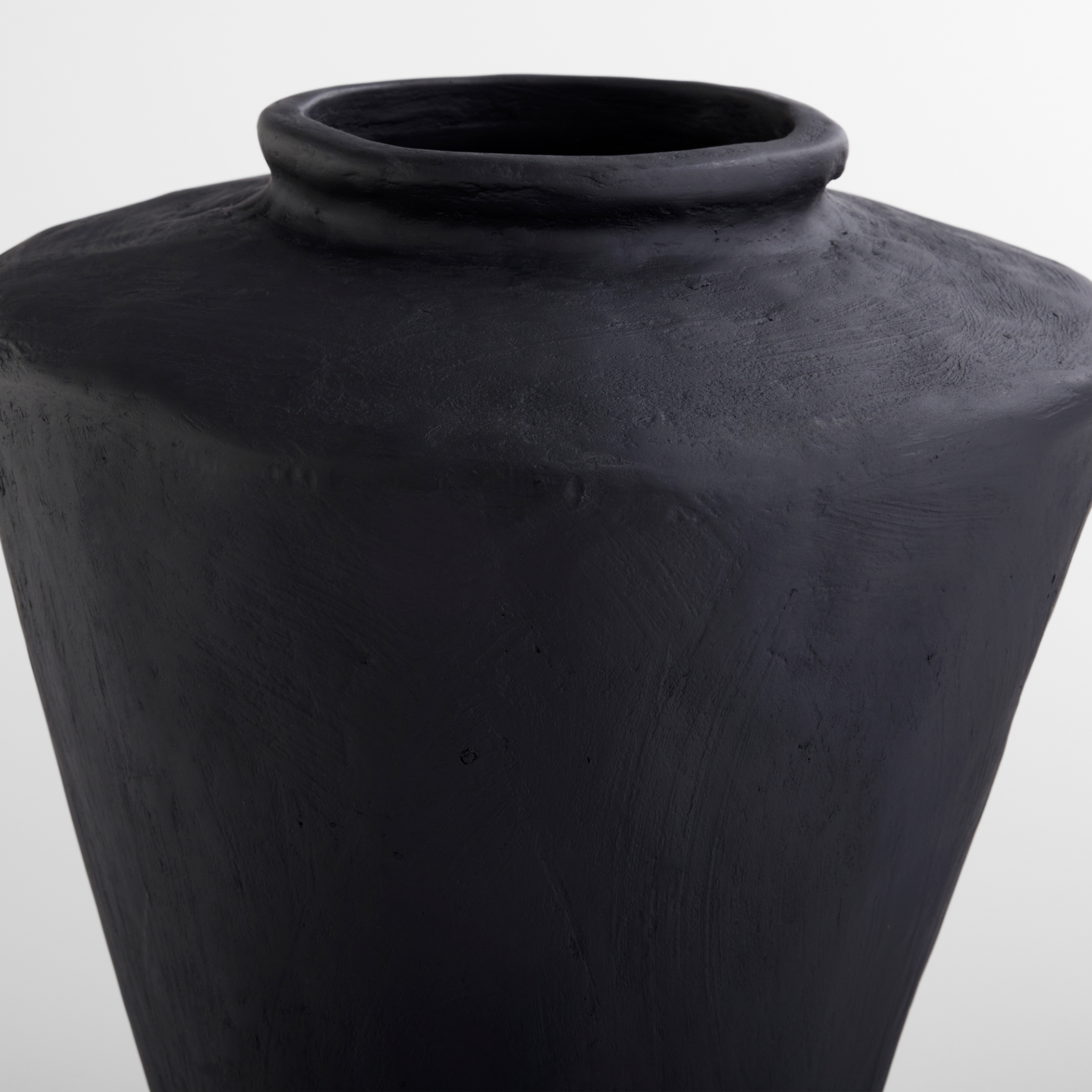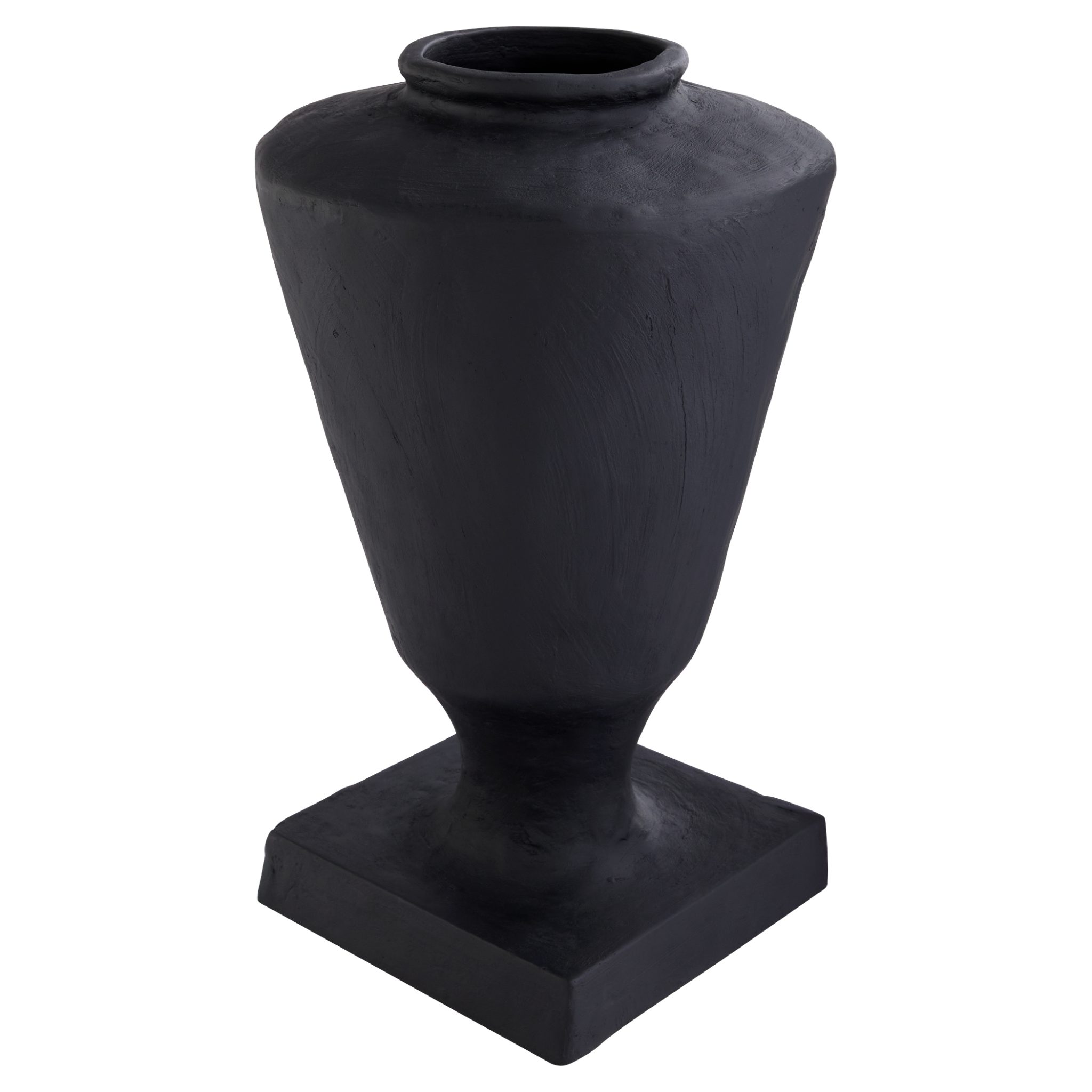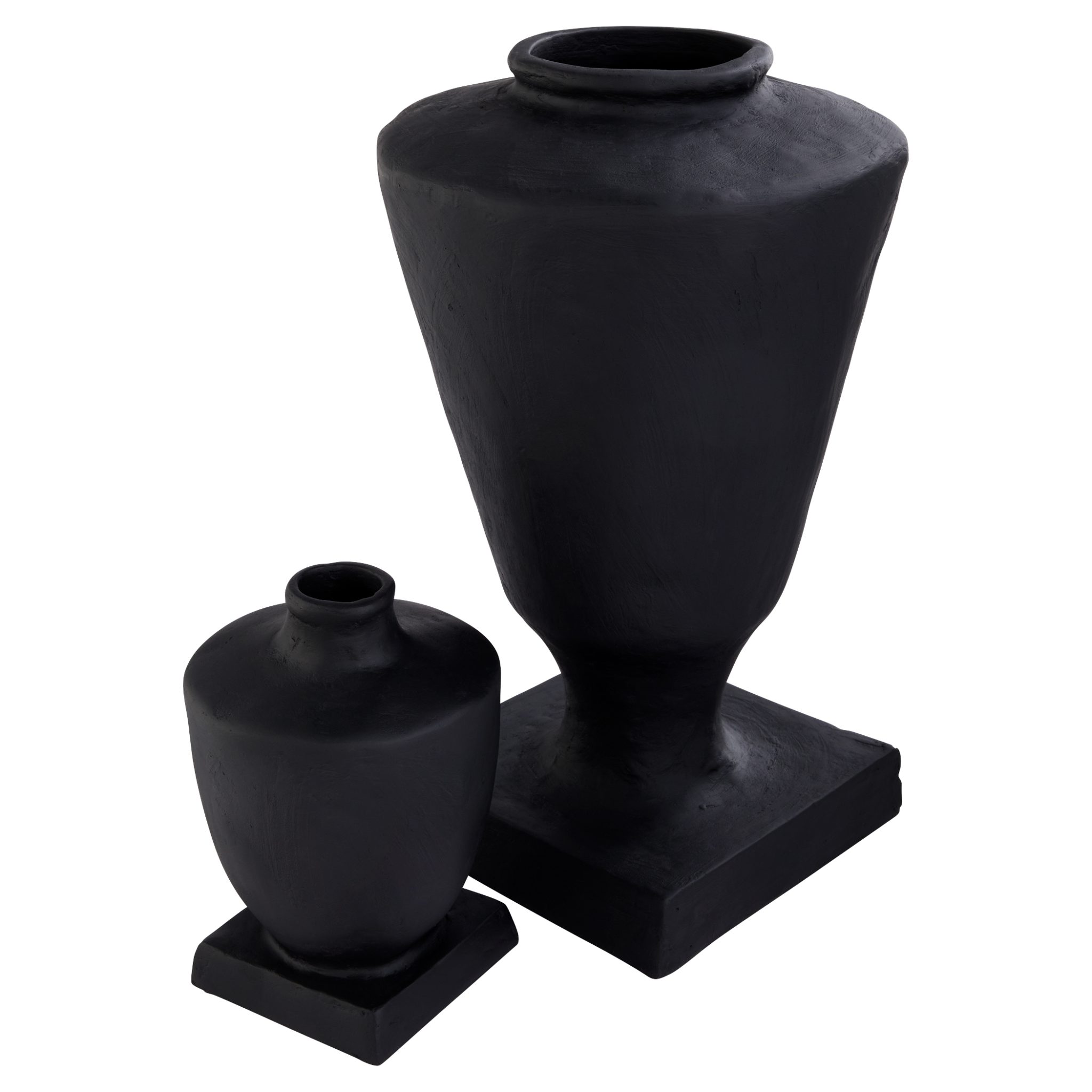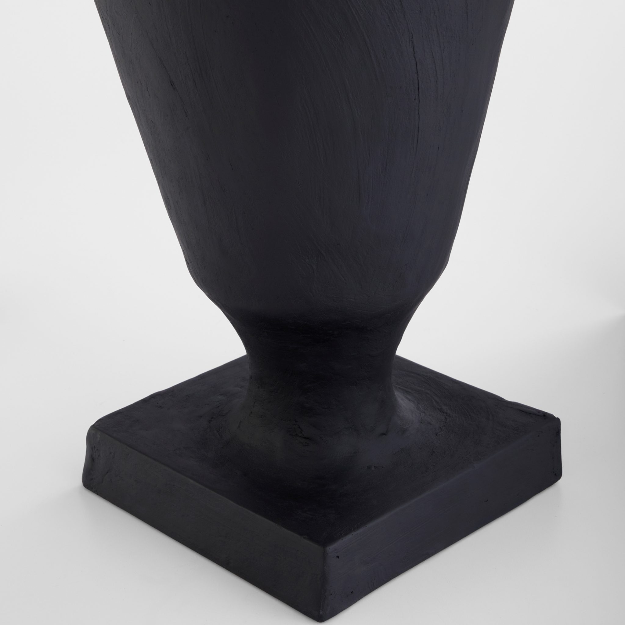 The Sparta Vases blends modern design with ancient influences, featuring a monochromatic Mediterranean aesthetic. Made from sustainable black eco-mix, it showcases textured surfaces, large scale, and bold form. Available in various shapes and sizes, it is perfect for individual use or creating a cohesive look.