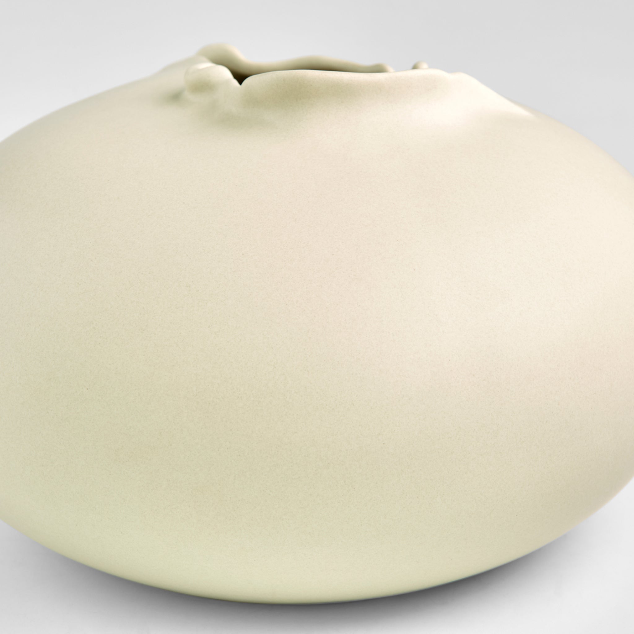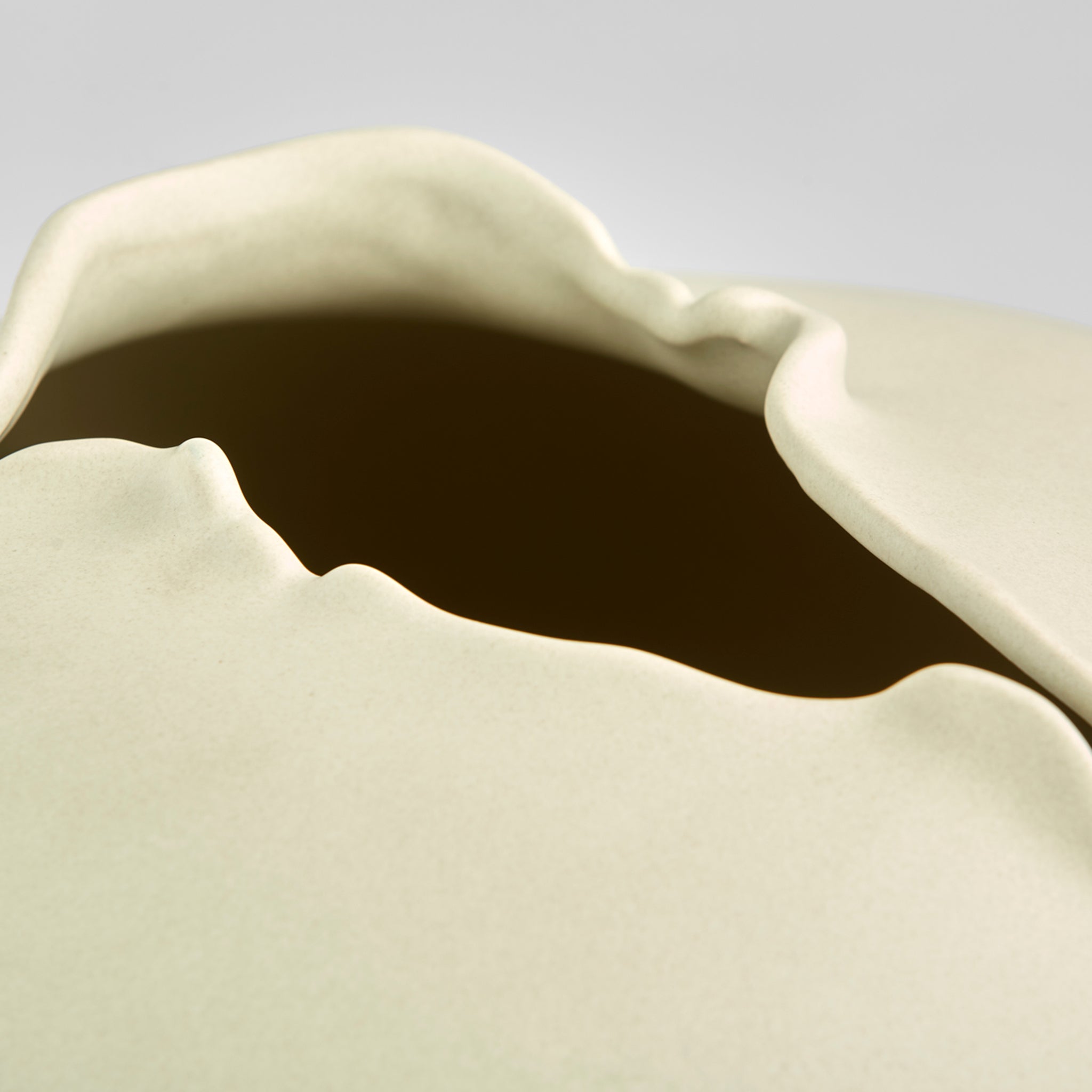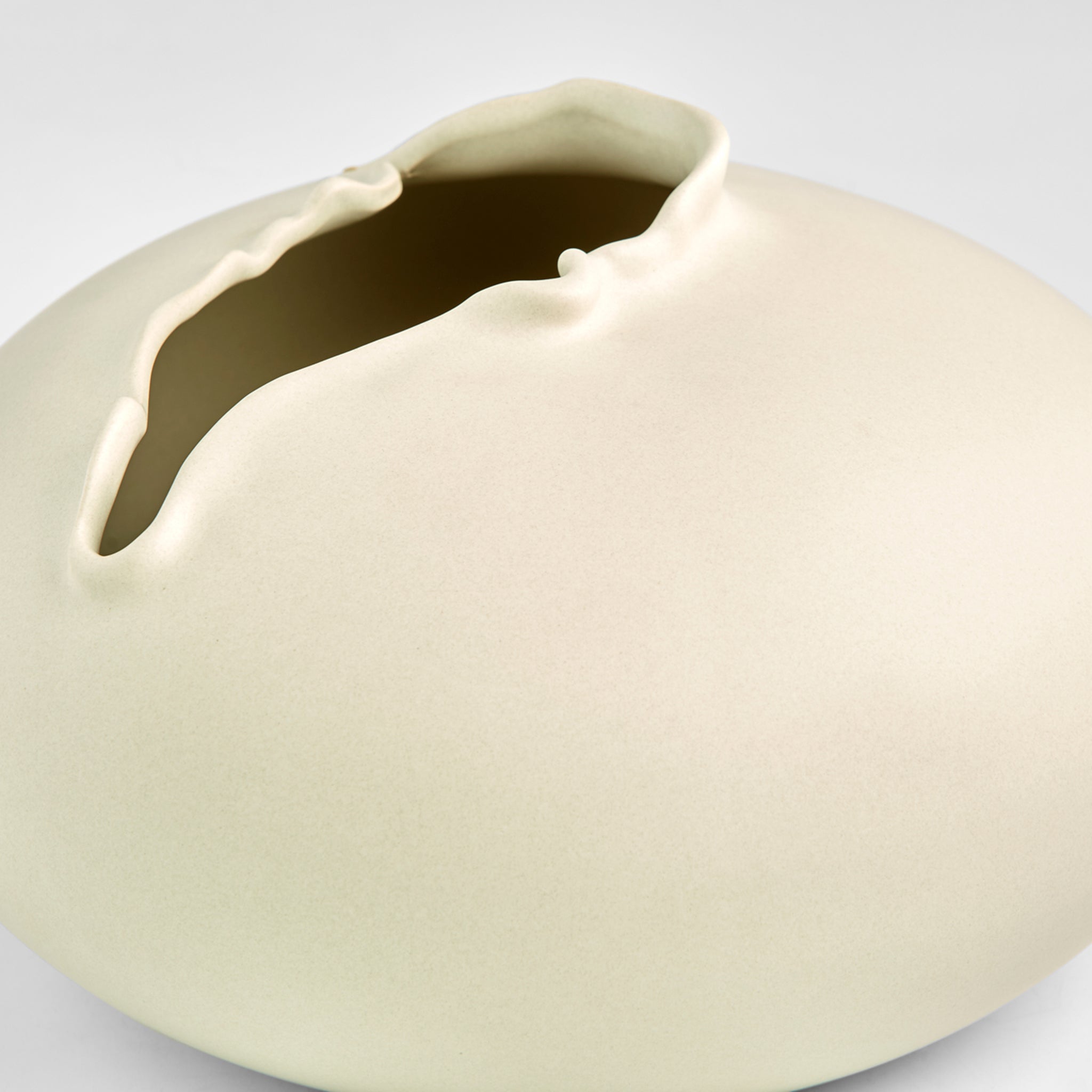 The distinct characteristic that sets the Tambora vase collection apart is the amorphous opening atop a rounded, low profile. The surrealistic shape echoes that which might be found untouched in nature. The off-white glazed ceramic body is watertight, allowing for the display of fresh or faux flora.
